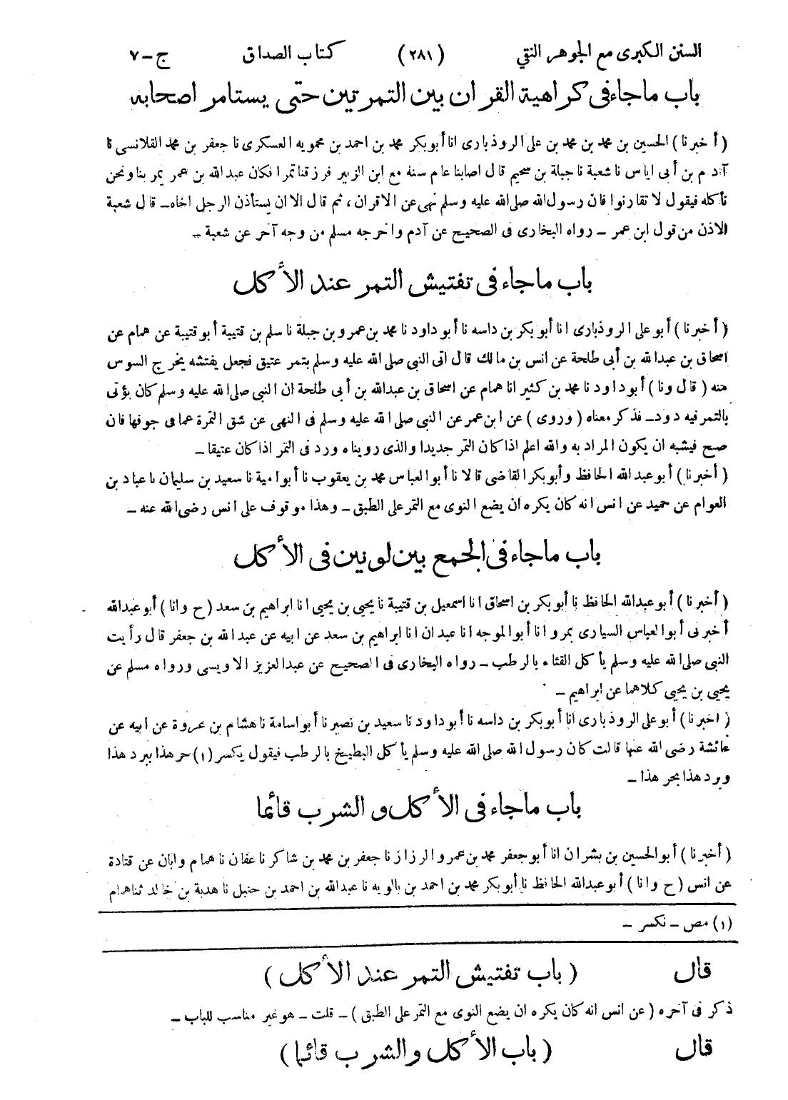 قال (باب تفتيش التمر عند الاكل) ذكر في آخره (عن انس انه كان يكره ان يضع النوى مع التمر على الطبق) - قلت - هو غير مناسب للباب - قال (بابا الاكل والشرب قائما)