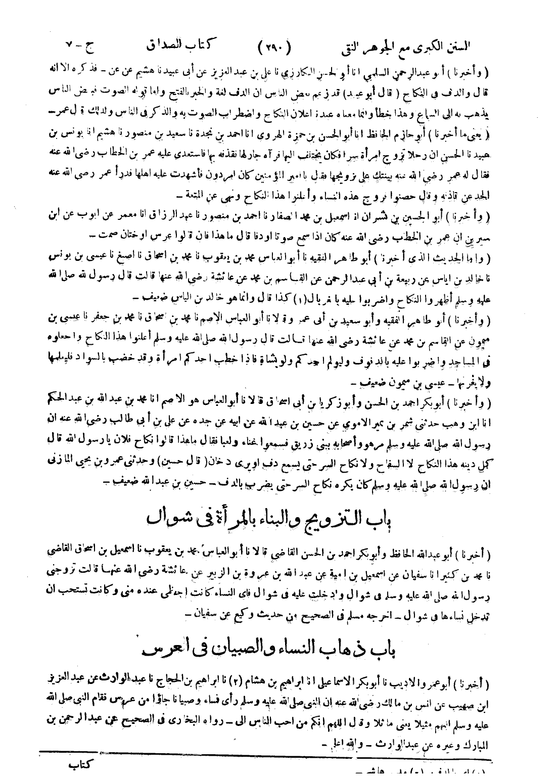 - (وأخبرنا) أبو بكر احمد بن الحسن وأبو زكريا بن أبى اسحاق قالا نا أبو العباس هو الاصم انا محمد بن عبد الله بن عبد الحكم انا ابن وهب حدثنى شمر بن نمير الاموى عن حسين بن عبد الله عن ابيه عن جده عن على بن أبى طالب رضى الله عنه ان رسول الله صلى الله عليه وسلم مر هو وأصحابه ببنى زريق فسمعوا غناء ولعبا فقال ما هذا قالوا نكاح فلان يارسول الله قال كمل دينه هذا النكاح لا السفاح ولا نكاح السر حتى يسمع دف أو يرى دخان (قال حسين) وحدثني عمرو بن يحيى المازنى ان رسول الله صلى الله عليه وسلم كان يكره نكاح السر حتى يضرب بالدف - حسين بن عبد الله ضعيف