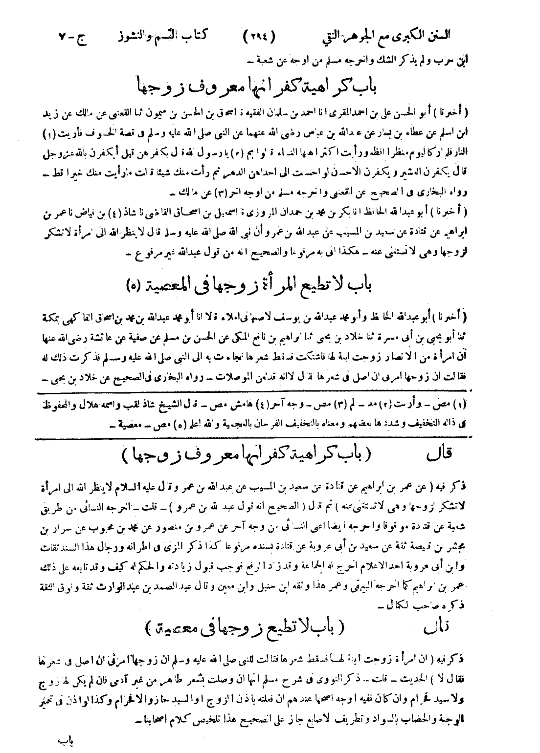 قال (باب كراهية كفرانها معروف زوجها) ذكر فيه (عن عمر بن ابراهيم عن قتادة عن سعيد بن المسيب عن عبد الله بن عمر وقال عليه السلام لا ينظر الله إلى امرأة لا تشكر لزوجها وهى لا تستغنى عنه) ثم قال (الصحيح انه قول عبد الله بن عمرو) - قلت - اخرجه النسائي من طريق شعبة عن قتادة موقوفا واخرجه ايضا اعني النسائي من وجه آخر عن عمرو بن منصور عن محمد بن محبوب عن سرار بن مجشر بن قيصة ثقة عن سيعد بن أبى عروبة عن قتادة بسنده مرفوعا كذا ذكر المزى في اطرافه ورجال هذا السند ثقات وابن أبى عروبة احد الاعلام اخرج له الجماعة وقد زاد الرفع فوجب قبول زيادته والحكم له كيف وقد تابعه على ذلك عمر بن ابراهيم كما اخرجه البيهقى وعمر هذا وثقة ابن حنبل وابن معين وقال عبد الصمد بن عبد الوارث ثقة وفوق الثقة ذكره صاحب لكمال - قال (باب لا تطيع زوجها في معصية) ذكر فيه (ان امرأة زوجت ابنة لها فسقط شعرها فقالت للنبى صلى الله عليه وسلم ان زوجها امرني ان اصل في شعرها فقال لا) الحديث - قلت - ذكر النووي في شرح مسلم انها ان وصلت بشعر طاهر من غير آدمى فان لم يكن لها زوج ولا سيد فحرام وان كان ففيه اوجه اصحها عندهم ان فعلته باذن الزوج أو السيد حازو الا فحرام وكذا لو اذن في تحمير الوجنة والحضاب بالسواد وتطريف لاصابع جاز على الصحيح هذا تلخيص كلام اصحابنا -