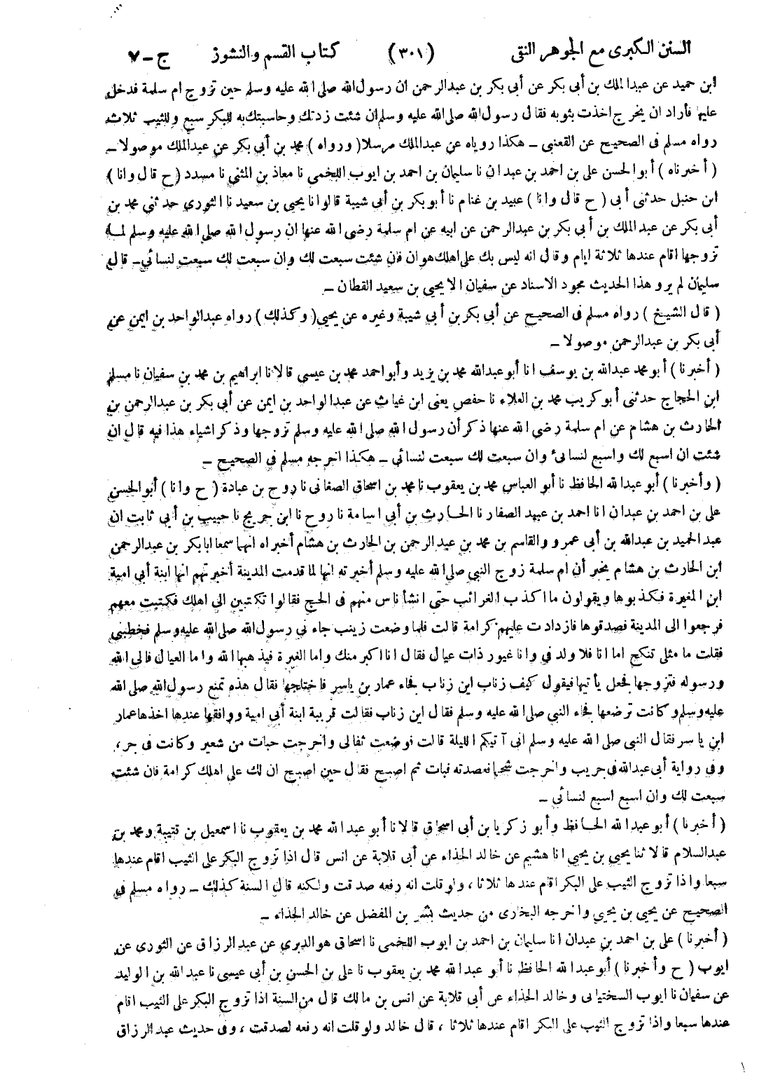 عبد السلام قالا ثنا يحيى بن يحيى انا هشيم عن خالد الحذاء عن أبى قلابة عن انس قال إذا تزوج البكر على الثيب اقام عندها سبعا وإذا تزوج الثيب على البكر اقام عندها ثلاثا ، ولو قلت انه رفعه صدقت ولكنه قال السنة كذلك - رواه مسلم في الصحيح عن يحيى بن يحيى واخرجه البخاري من حديث بشر بن المفضل عن خالد الحذاء