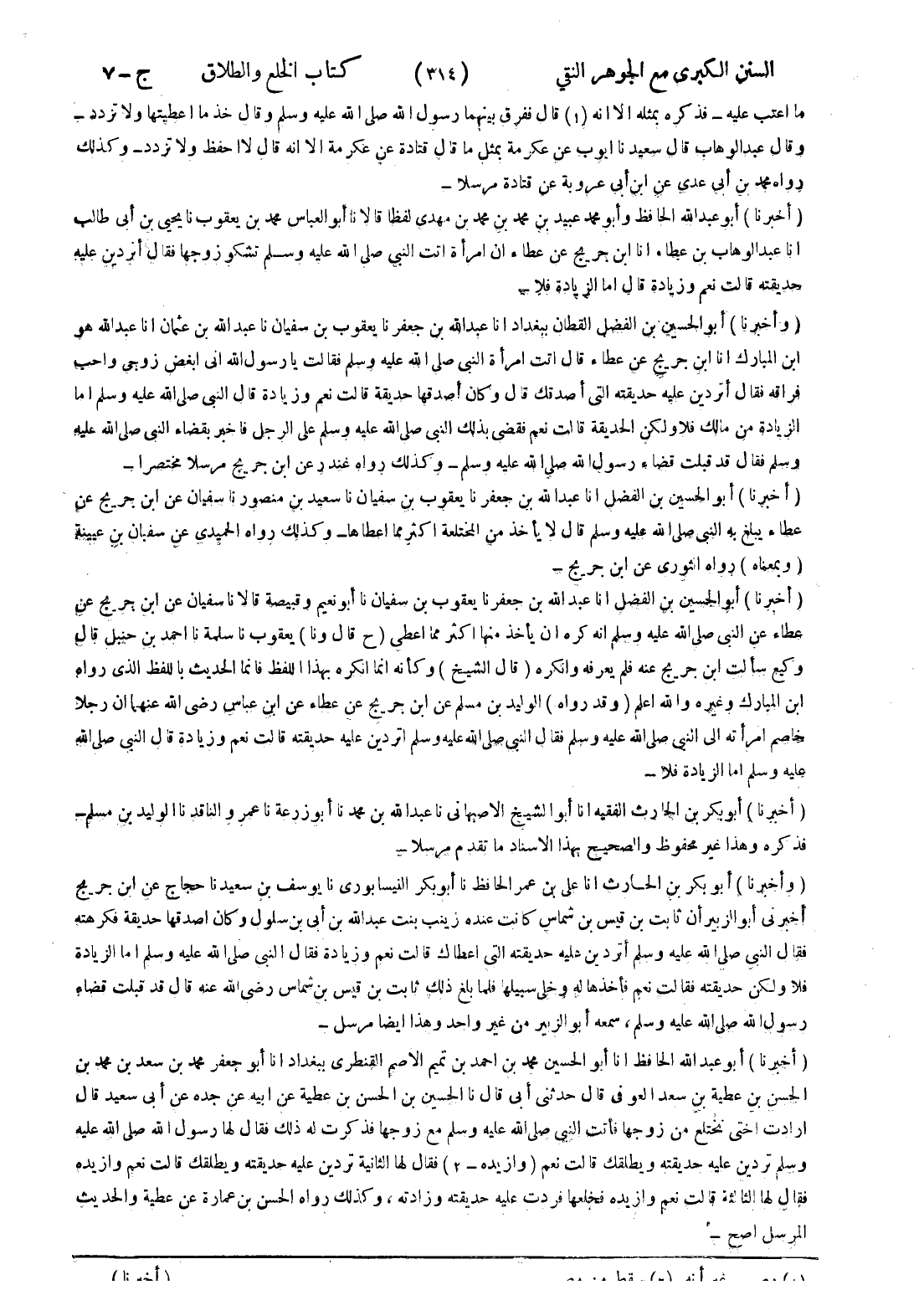 - (أخبرنا) أبو عبد الله الحافظ انا أبو الحسين محمد بن احمد بن تميم الاصم القنطرى ببغداد انا أبو جعفر محمد بن سعد بن محمد بن الحسن بن عطية بن سعد العوفى قال حدثنى أبى قال نا الحسين بن الحسن بن عطية عن ابيه عن جده عن أبى سعيد قال ارادت اختى تختلع من زوجها فأتت النبي صلى الله عليه وسلم مع زوجها فذكرت له ذلك فقال لها رسول الله صلى الله عليه وسلم تردين عليه حديقته ويطلقك قالت نعم (وازيده - 2) فقال لها الثانية تردين عليه حديقته ويطلقك قالت نعم وازيده فقال لها الثالثة قالت نعم وازيده فخلعها فردت عليه حديقته وزادته ، وكذلك رواه الحسن بن عمارة عن عطية والحديث المرسل اصح -