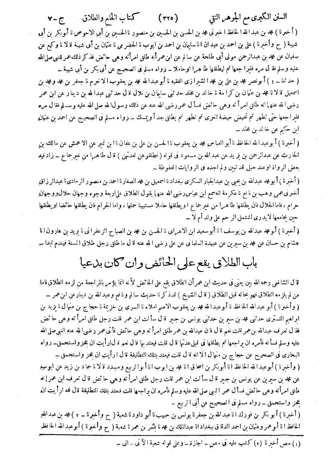 (ح وأخبرنا) على بن احمد بن عبدان انا سليمان بن احمد بن ايوب نا الحضرمي نا عثمان بن أبى شيبة قالا نا وكيع عن سفيان عن محمد بن عبد الرحمن مولى أبى طلحة عن سالم عن ابن عمر أنه طلق امرأته وهى حائض فذكر ذلك عمر للنبى صلى الله عليه وسلم فقال مره فليراجعها ثم ليطلقها طاهرا أو حاملا - رواه مسلم في الصحيح عن أبى بكر بن أبى شيبة - (حدثنا - 1) أبو نصر محمد بن على بن محمد الشيرازي الفقيه نا أبو عبد الله محمد بن يعقوب الاخرم نا جعفر بن محمد ومحمد بن اسمعيل قالا نا محمد بن عثمان بن كرامة نا خالد بن مخلد حدثنى سليمان بن بلال قال حدثنى عبد الله بن دينار عن ابن عمر رضى الله عنهما انه طلق امرأته وهى حائض فسأل عمر رضى الله عنه عن ذلك رسول الله صلى الله عليه وسلم فقال مره فليراجعها حتى تطهر ثم تحيض حيضة اخرى ثم تطهر ثم يطلق بعد أو يمسك - رواه مسلم في الصحيح عن احمد بن عثمان ابن حكيم عن خالد بن مخلد