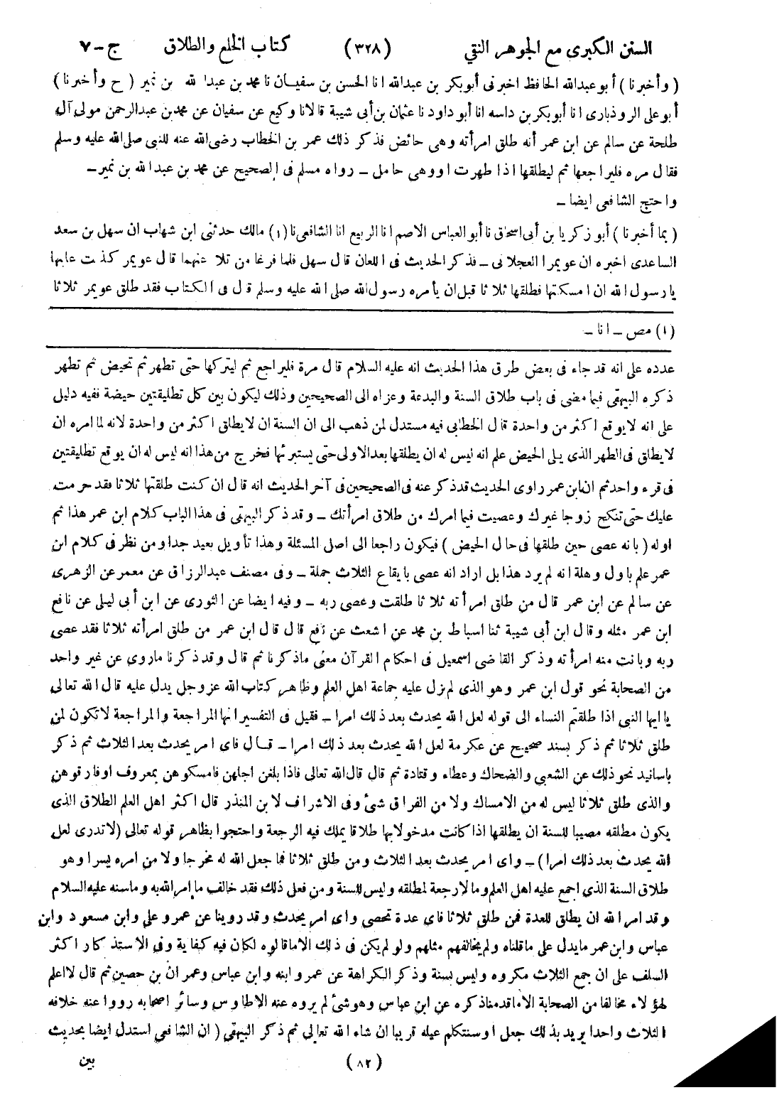 عدده على انه قد جاء في بعض طرق هذا الحديث انه عليه السلام قال مرة فليراجع ثم ليتركها حتى تطهر ثم تحيض ثم تطهر ذكره البيهقى فيما مضى في باب طلاق السنة والبدعة وعزاه إلى الصحيحين وذلك ليكون بين كل تطليقتين حيضة ففيه دليل على انه لا يوقع اكثر من واحدة قال الخطابى فيه مستدل لمن ذهب إلى ان السنة ان لا يطلق اكثر من واحدة لانه لما امره ان لا يطلق في الطهر الذى يلى الحيض علم انه ليس له ان يطلقها بعد الاولى حتى يستبرئها فخرج من هذا انه ليس له ان يوقع تطليقتين في قرء واحد ثم ان ابن عمر راوي الحديث قد ذكر عنه في الصحيحين في آخر الحديث انه قال ان كنت طلقتها ثلاثا فقد حرمت عليك حتى تنكح زوجا غيرك وعصيت فيما امرك من طلاق امرأتك - وقد ذكر البيهقى في هذا الباب كلام ابن عمر هذا ثم اوله (بانه عصى حين طلقها في حال الحيض) فيكون راجعا إلى اصل المسألة وهذا تأويل بعيد جدا ومن نظر في كلام ابن عمر علم باول وهلة انه لم يرد هذا بل اراد انه عصى بايقاع الثلاث جملة - وفي مصنف عبد الرزاق عن معمر عن الزهري عن سالم عن ابن عمر قال من طلق امرأته ثلاثا طلقت وعصى ربه - وفيه ايضا عن الثوري عن ابن أبى ليلى عن نافع ابن عمر مثله وقال ابن أبى شيبة ثنا اسباط بن محمد عن اشعث عن نافع قال قال ابن عمر من طلق امرأته ثلاثا فقد عصى ربه وبانت منه امرأته وذكر القاضى اسمعيل في احكام القرآن معنى ما ذكرنا ثم قال وقد ذكرنا ما روى عن غير واحد من الصحابة نحو قول ابن عمر وهو الذى لم يزل عليه جماعة اهل العلم وظاهر كتاب الله عزوجل يدل عليه قال الله تعالى يا ايها النبي إذا طلقتم النساء إلى قوله لعل الله يحدث بعد ذلك امرا - فقيل في التفسير انها المراجعة والمراجعة لا تكون لمن طلق ثلاثا ثم ذكر بسند صحيح عن عكرمة لعل الله يحدث بعد ذلك امرا - قال فاى امر يحدث بعد الثلاث ثم ذكر باسانيد نحو ذلك عن الشعبى والضحاك وعطاء وقتادة ثم قال قال الله تعالى فإذا بلغن اجلهن فامسكوهن بمعروف أو فارقوهن والذى طلق ثلاثا ليس له من الامساك ولا من الفراق شئ وفي الاشراف لابن المنذر قال اكثر اهل العلم الطلاق الذى