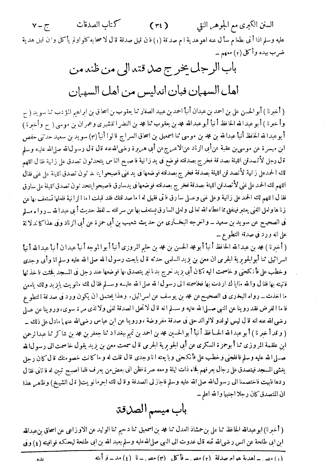 (ح وأخبرنا) أبو عبد الله الحافظ أنبأ عبد الله بن محمد بن موسى ثنا اسمعيل بن اسحاق السراج قالوا أنبأ (3) سويد بن سعيد حدثنى حفص ابن ميسرة عن موسى بن عقبة عن أبى الزناد عن الاعرج عن أبى هريرة رضى الله عنه قال قال رسول الله صلى الله عليه وسلم قال رجل لاتصدقن الليلة بصدقة فخرج بصدقته فوضع في يد زانية فاصبح الناس يتحدثون تصدق على زانية فقال اللهم لك الحمد على زانية لا تصدقن الليلة بصدقة فخرج بصدقته فوضعها في يد غنى فاصبحوا يتحدثون تصدق الليلة على غنى فقال اللهم لك الحمد على غنى لاتصدقن الليلة بصدقة فخرج بصدقته فوضعها في يد سارق فاصبحوا يتحدثون تصدق الليلة على سارق فقال اللهم لك الحمد على زانية وعلى غنى وعلى سارق فاتى فقيل له اما صدقتك فقد قبلت اما الزانية فلعلها تستعف بها عن زناها ولعل الغنى يعتبر فينفق مما اعطاه الله تعالى ولعل السارق يستعف بها عن سرقته - لفظ حديث أبى عبد الله - رواه مسلم في الصحيح عن سويد بن سعيد - واخرجه البخاري من حديث شعيب بن أبى حمزة عن أبى الزناد وفي هذا كالدلالة على انه ورد في صدقة التطوع