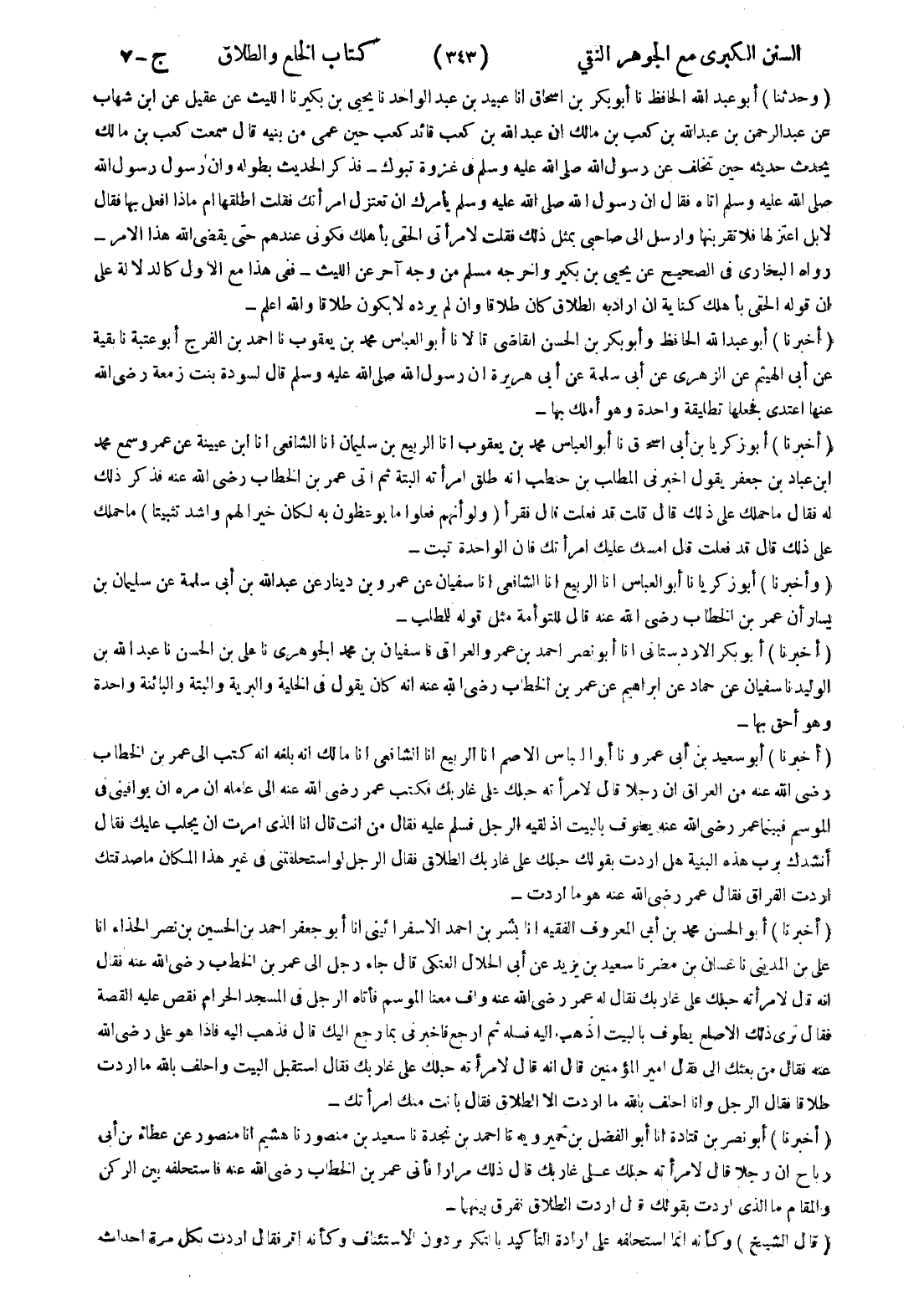 - (أخبرنا) أبو الحسن محمد بن أبى المعروف الفقيه انا بشر بن احمد الاسفرائينى انا أبو جعفر احمد بن الحسين بن نصر الحذاء انا على بن المدينى نا غسان بن مضر نا سعيد بن يزيد عن أبى الحلال العتكى قال جاء رجل إلى عمر بن الخطاب رضى الله عنه فقال انه قال لامرأته حبلك على غاربك فقال له عمر رضى الله عنه واف معنا الموسم فأتاه الرجل في المسجد الحرام فقص عليه القصة فقال ترى ذلك الاصلع يطوف بالبيت اذهب إليه فسله ثم ارجع فاخبرني بما رجع اليك قال فذهب إليه فإذا هو على رضى الله عنه فقال من بعثك إلى فقال امير المؤمنين قال انه قال لامرأته حبلك على غاربك فقال استقبل البيت واحلف بالله ما اردت طلاقا فقال الرجل وانا احلف بالله ما اردت الا الطلاق فقال بانت منك امرأتك