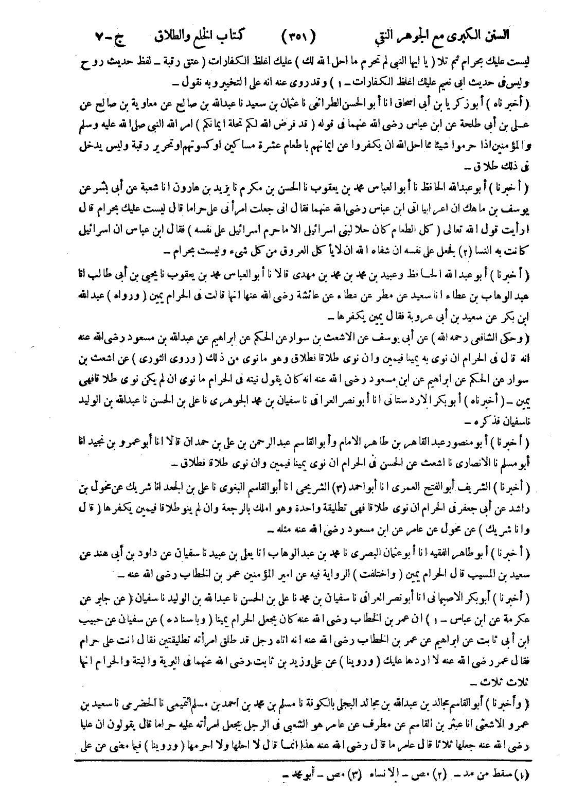 - (أخبرنا) أبو بكر الاصبهاني انا أبو نصر العراقى نا سفيان بن محمد نا على بن الحسن نا عبد الله بن الوليد نا سفيان) عن جابر عن عكرمة عن ابن عباس - 1) ان عمر بن الخطاب رضى الله عنه كان يجعل الحرام يمينا (وباسناده) عن سفيان عن حبيب ابن أبى ثابت عن ابراهيم عن عمر بن الخطاب رضى الله عنه انه اتاه رجل قد طلق امرأته تطليقتين فقال انت على حرام فقال عمر رضى الله عنه لا اردها عليك