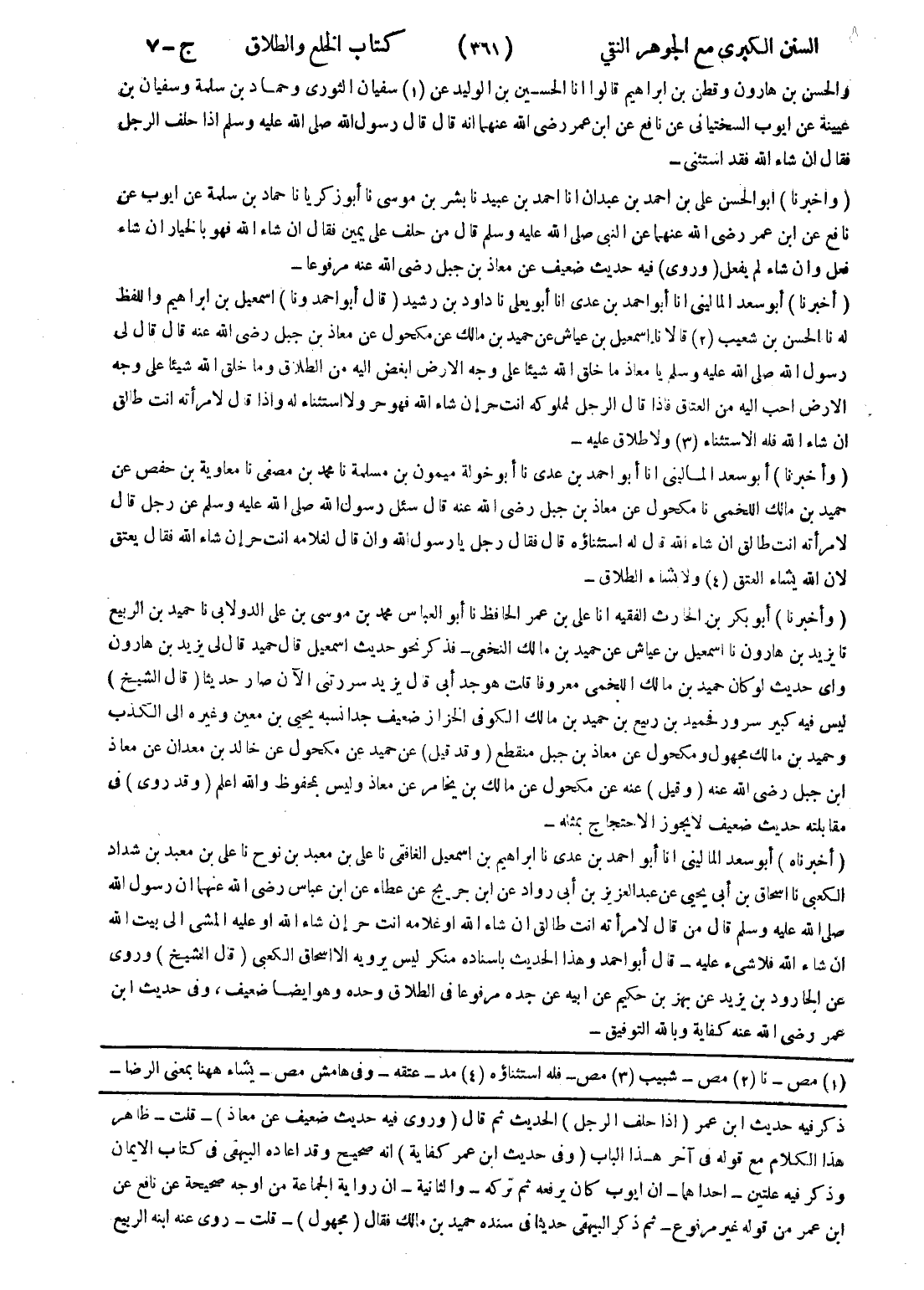 ذكر فيه حديث ابن عمر (إذا حلف الرجل) الحديث ثم قال (وروى فيه حديث ضعيف عن معاذ) - قلت - ظاهر هذا الكلام مع قوله في آخر هذا الباب (وفي حديث ابن عمر كفاية) انه صحيح وقد اعاده البيهقى في كتاب الايمان وذكر فيه علتين - احداهما - ان ايوب كان يرفعه ثم تركه - والثانية - ان رواية الجماعة من اوجه صحيحة عن نافع عن ابن عمر من قوله غير مرفوع - ثم ذكر البيهقى حديثا في سنده حميد بن مالك فقال (مجهول) - قلت - روى عنه ابنه الربيع