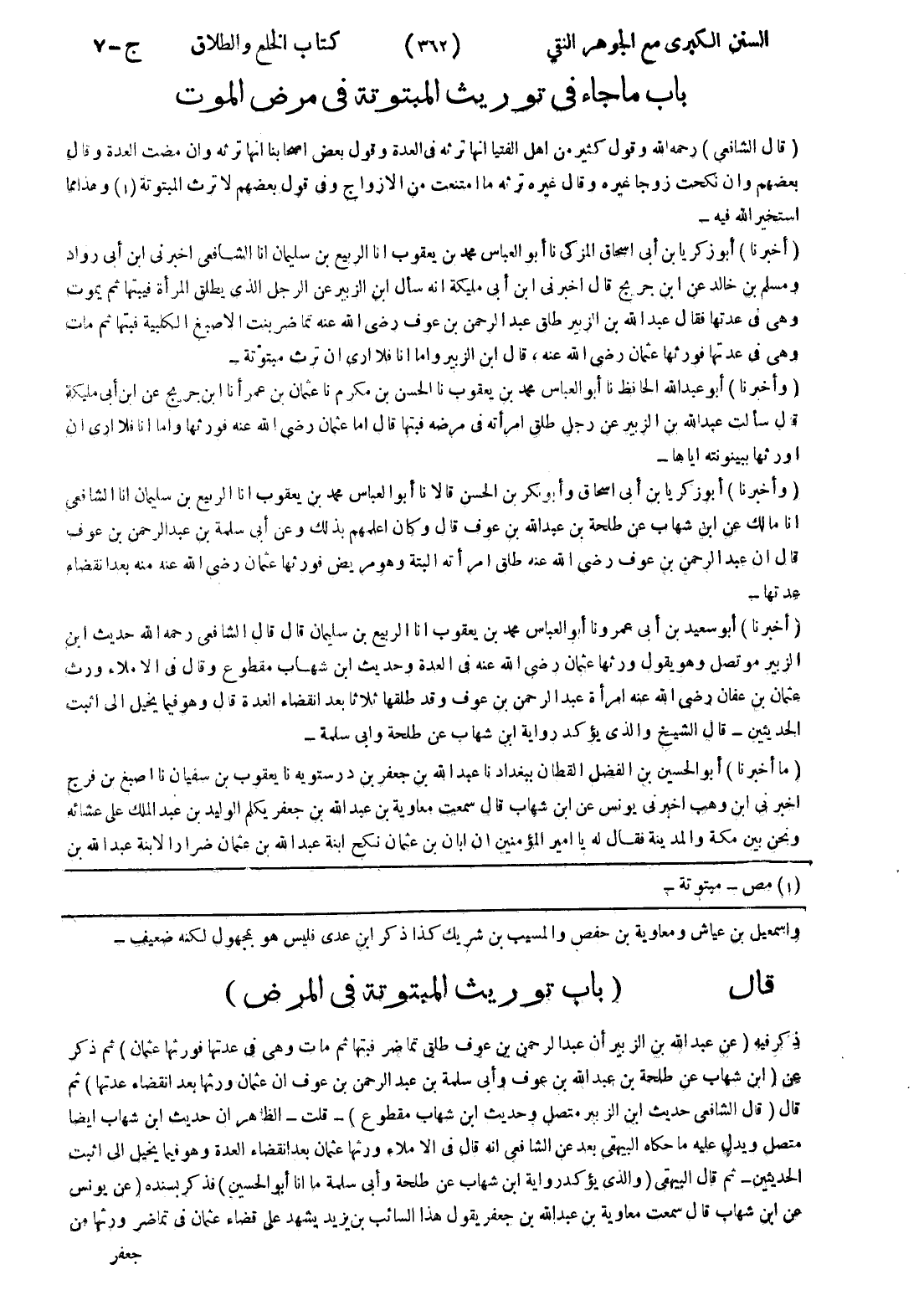 قال (باب توريث المبتوتة في المرض) ذكر فيه (عن عبد الله بن الزبير أن عبد الرحمن بن عوف طلق تماضر فبتها ثم مات وهى في عدتها فورثها عثمان) ثم ذكر عن (ابن شهاب عن طلحة بن عبد الله بن عوف وأبى سلمة بن عبد الرحمن بن عوف ان عثمان ورثها بعد انقضاء عدتها) ثم قال (قال الشافعي حديث ابن الزبير متصل وحديث ابن شهاب مقطوع) - قلت - الظاهر ان حديث ابن شهاب ايضا متصل ويدل عليه ما حكاه البيهقى بعد عن الشافعي انه قال في الاملاء ورثها عثمان بعد انقضاء العدة وهو فيما يخيل إلى اثبت الحديثين - ثم قال البيهقى (والذى يؤكد رواية ابن شهاب عن طلحة وأبى سلمة ما انا أبو الحسين) فذكر بسنده (عن يونس عن ابن شهاب قال سمعت معاوية بن عبد الله بن جعفر يقول هذا السائب بن يزيد يشهد على قضاء عثمان في تماضر ورثها من