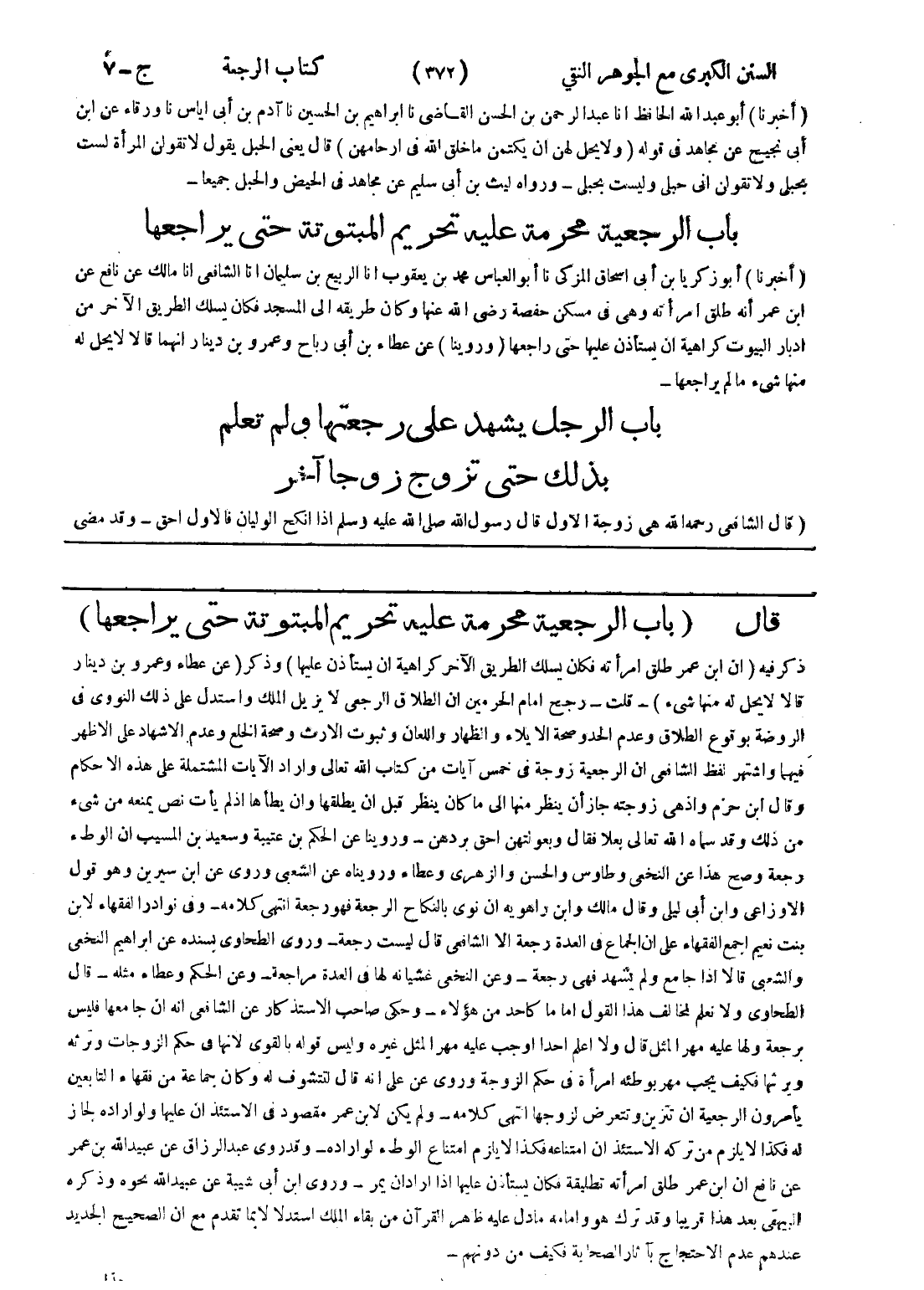 فيهما واشتهر لفظ الشافعي ان الرجعية زوجة في خمس آيات من كتاب الله تعالى واردا الآيات المشتملة على هذه الاحكام وقال ابن حزم واذهى زوجته جاز أن ينظر منها إلى ما كان ينظر قبل ان يطلقها وان يطأها إذ لم يأت نص يمنعه من شئ من ذلك وقد سماه الله تعالى بعلا فقال وبعولتهن احق بردهن - وروينا عن الحكم بن عتيبة وسعيد بن المسيب ان الوطئ رجعة وصح هذا عن النخعي وطاوس والحسن والزهرى وعطاء ورويناه عن الشعبى وروى عن ابن سيرين وهو قول الاوزاعي وابن أبى ليلى وقال مالك وابن راهويه ان نوى بالنكاح الرجعة فهو رجعة انتهى كلامه - وفي نوادر الفقهاء لابن بنت نعيم اجمع الفقهاء على ان الجماع في العدة رجعة الا الشافعي قال ليست رجعة - وروى الطحاوي بسنده عن ابراهيم النخعي والشعبى قالا إذا جامع ولم يشهد فهى رجعة - وعن النخعي غشيانه لها في العدة مراجعة - وعن الحكم وعطاء مثله - قال الطحاوي ولا نعلم لمخالف هذا القول اما ما كاحد من هؤلاء - وحكى صاحب الاستذكار عن الشافعي انه ان جامعها فليس برجعة ولها عليه مهر المثل قال ولا اعلم احدا اوجب عليه مهر المثل غيره ولس قوله بالقوى لانها في حكم الزوجات وترثه ويرثها فكيف يجب مهر بوطئه امرأة في حكم الزوجة وروى عن على انه قال لتتشوف له وكان جماعة من فقهاء التابعين يأمرون الرجعية ان تتزين وتتعرض لزوجها انتهى كلامه - ولم يكن لابن عمر مقصود في الاستئذان عليها ولو اراده لجاز له فكذا لا يلزم من تركه الاستئذان امتناعه فكذا لا يلزم امتناع الوطئ لوارده - وقد روى عبد الرزاق عن عبيد الله بن عمر عن نافع ان ابن عمر طلق امرأته تطليقة فكان يستأذن عليها إذا اراد ان يمر - وروى ابن أبى شيبة عن عبيد الله نحوه وذكره البيهقى بعد هذا قريبا وقد ترك هو وامامه ما دل عليه ظاهر القرآن من بقاء الملك استدلا لا بما تقدم مع ان الصحيح الجديد عندهم عدم الاحتجاج بآثار الصحابة فكيف من دونهم -
