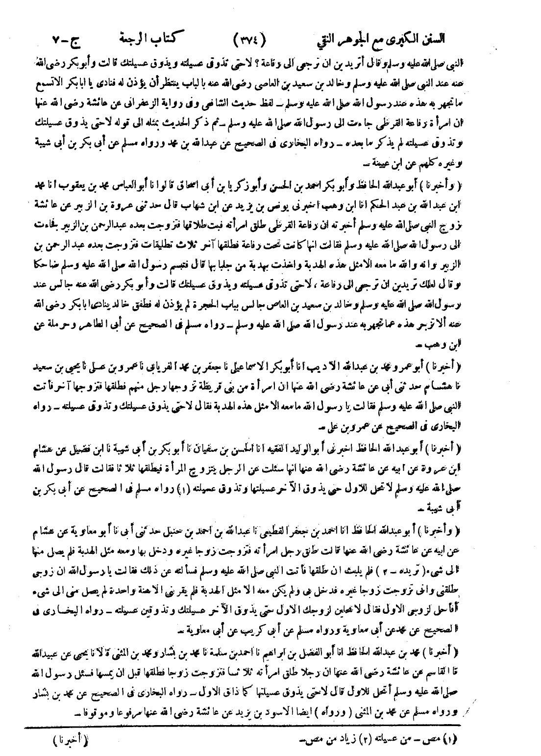 - (أخبرنا) أبو عمرو محمد بن عبد الله الاديب انا أبو بكر الاسماعيلي نا جعفر بن محمد الفريابى نا عمرو بن على نا يحيى بن سعيد نا هشام حدثنى أبى عن عائشة رضى الله عنها ان امرأة من بنى قريظة تزوجها رجل منهم فطلقها فتزوجها آخر فأتت النبي صلى الله عليه وسلم فقالت يا رسول الله ما معه الا مثل هذه الهدبة فقال لا حتى يذوق عسيلتك وتذوقي عسيلته - رواه البخاري في الصحيح عن عمرو بن على