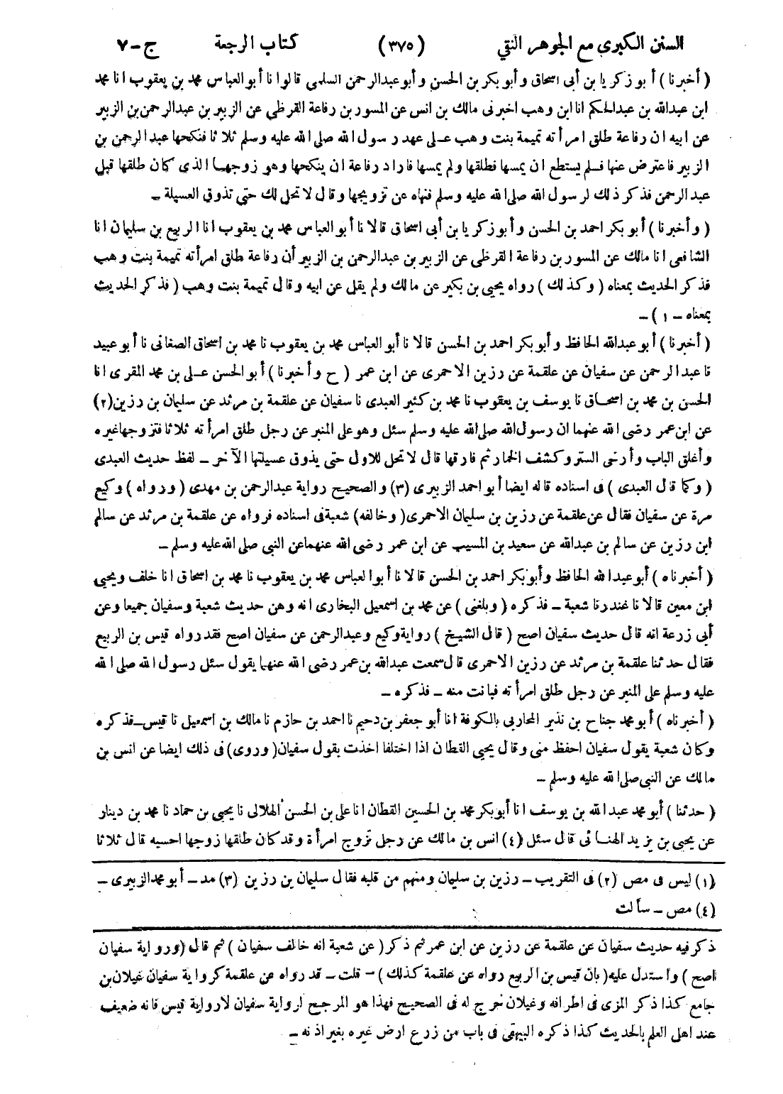 ذكر فيه حديث سفيان عن علقمة عن رزين عن ابن عمر ثم ذكر (عن شعبة انه خالف سفيان) ثم قال (ورواية سفيان اصح واسدل عليه (بان قيس بن الربيع رواه عن علقمة كذلك) - قلت - قد رواه عن علقمة كرواية سفيان غيلان بن جامع كذا ذكر المزى في اطرافه وغيلان خرج له في الصحيح فهذا هو المرجح لرواية سفيان لا رواية قيس فانه ضعيف عند اهل العلم بالحديث كذا ذكره البيهقى في باب من زرع ارض غيره بغر اذنه -