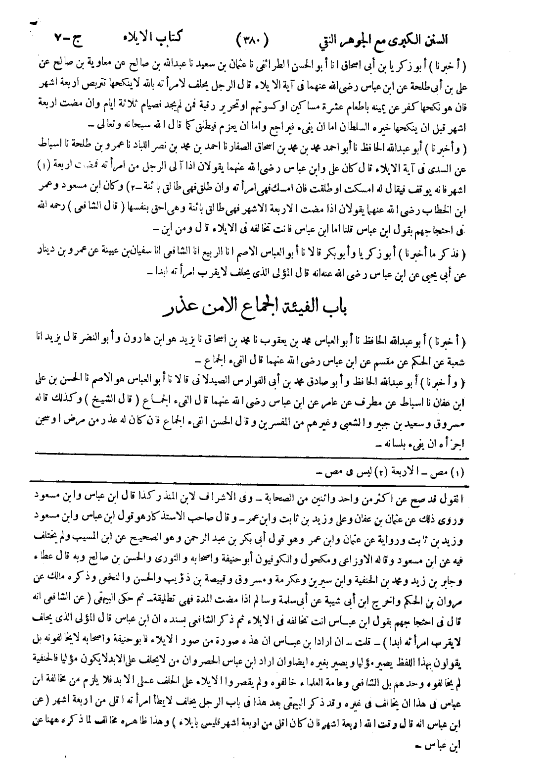 لا يقرب امرأته ابدا) - قلت - ان ارادا ابن عباس ان هذه صورة من صور الايلاء فابو حنيفة واصحابه لا يخالفونه بل يقولون بهذا اللفظ يصير مؤليا ويصير بغيره ايضا وان اراد ابن عباس الحصروان من لا يحلف على الابد لا يكون مؤليا فالحنيفة لم يخالفوه وحدهم بل الشافعي وعامة العلماء خالفوه ولم يقصروا الايلاء على الحلف على الابد فلا يلزم من مخالفة ابن عباس في هذا ان يخالف في غيره وقد ذكر البيهقى بعد هذا في باب الرجل يحلف لا يطأ امرأته اقل من اربعة اشهر (عن ابن عباس انه قال وقت الله اربعة اشهر فان كان اقل من اربعة اشهر فليس بايلاء) وهذا ظاهره مخالف لما ذكره ههنا عن ابن عباس -