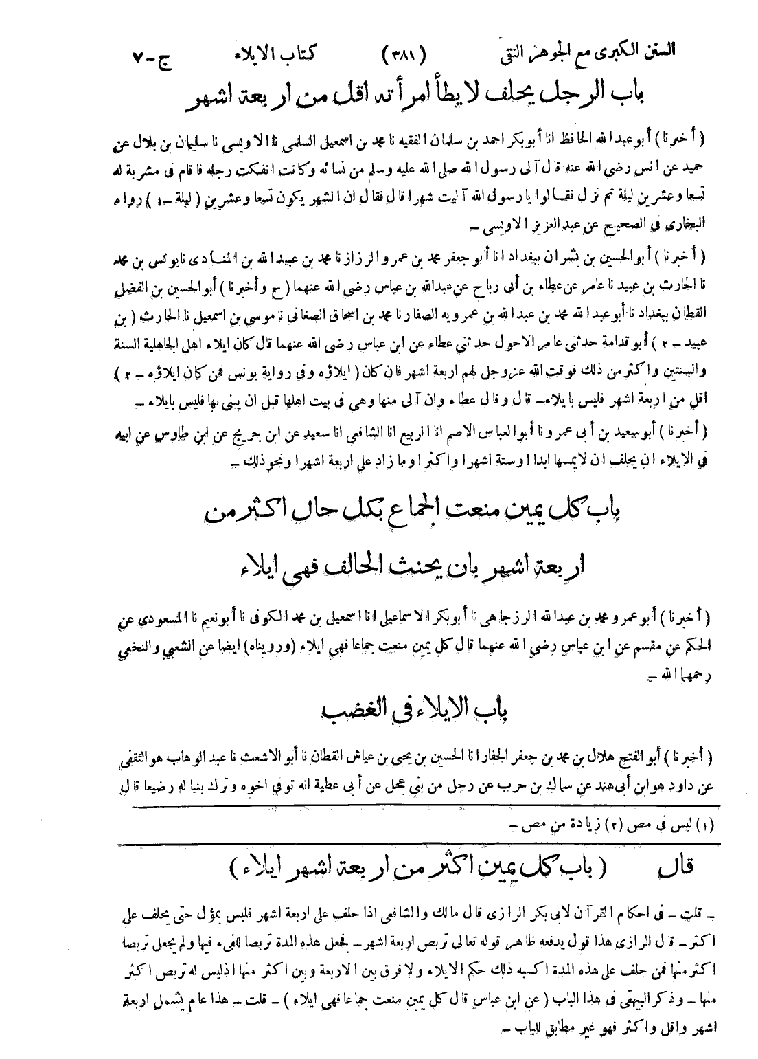 قال (باب كل يمين اكثر من اربعة اشهر ايلاء) - قلت - في احكام القرآن لابي بكر الرازي قال مالك والشافعي إذا حلف على اربعة اشهر فليس بمؤل حتى يحلف على اكثر - قال الرازي هذا قول يدفعه ظاهر قوله تعالى تربص اربعة اشهر - فجعل هذه المدة تربصا للفئ فيها ولم يجعل تربصا اكثر منها فمن حلف على هذه المدة اكسبه ذلك حكم الايلاء ولا فرق بين الاربعة وبين اكثر منها إذ ليس له تربص اكثر منها - وذكر البيهقى في هذا الباب (عن ابن عباس قال كل يمين منعت جماعا فهى ايلاء) - قلت - هذا عام يشمل اربعة اشهر واقل واكثر فهو غير مطابق للياب -