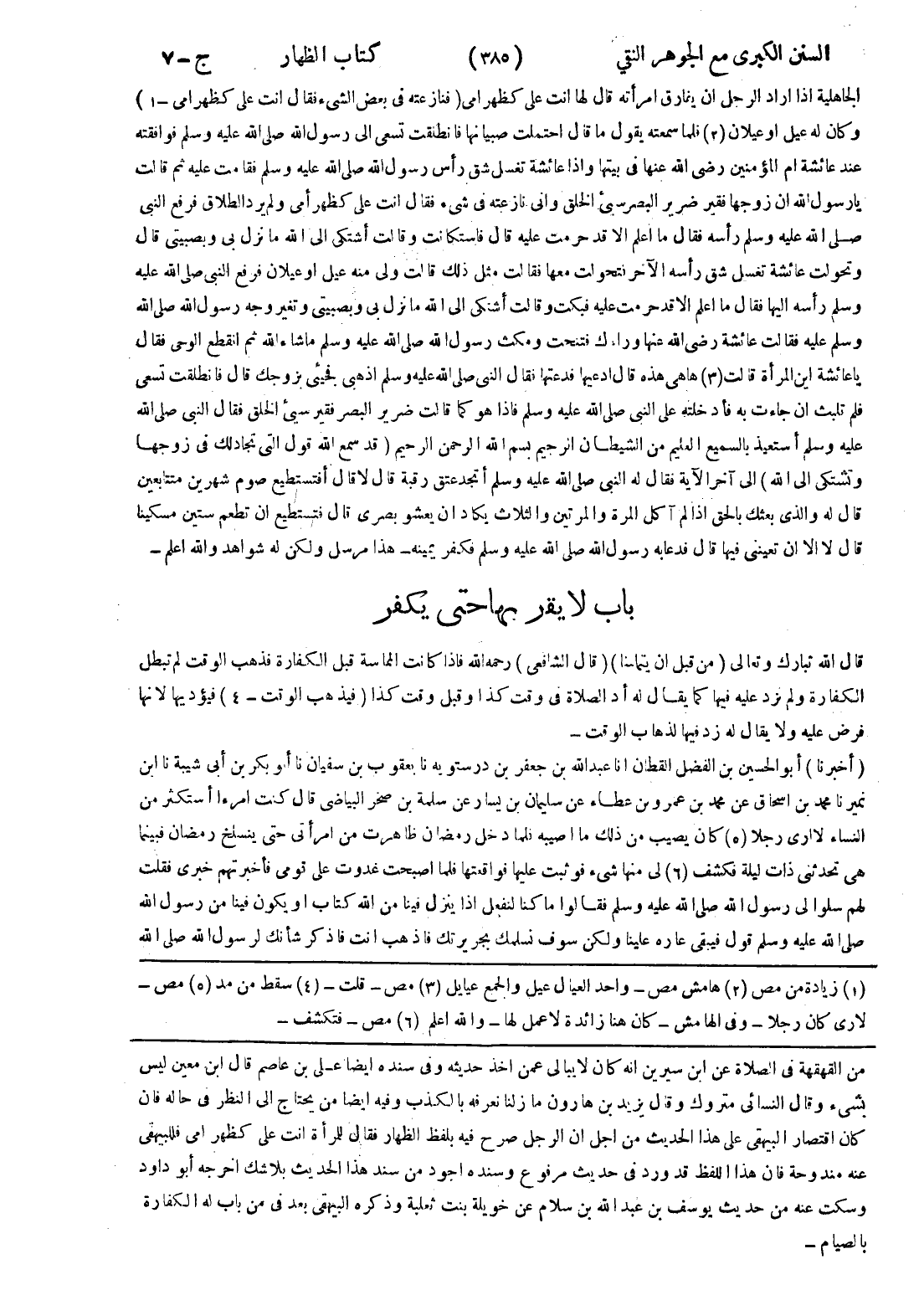 من القهقهة في الصلاة عن ابن سيرين انه كان لا يبالى عمن اخذ حديثه وفي سنده ايضا على بن عاصم قال ابن معين ليس بشئ وقال النسائي متروك وقال يزيد بن هارون مازلنا نعرفه بالكذب وفيه ايضا من يحتاج إلى النظر في حاله فان كان اقتصار البيهقى على هذا الحديث من اجل ان الرجل صرح فيه بلفظ الظهار فقال للمرأة انت على كظهر امى فللبيهقي عنه مندوحة فان هذا اللفظ قد ورد في حديث مرفوع وسنده اجود من سند هذا الحديث بلا شك اخرجه أبو داود وسكت عنه من حديث يوسف بن عبد الله بن سلام عن خويلة بنت ثعلبة وذكره البيهقى بعد في من باب له الكفارة بالصيام -