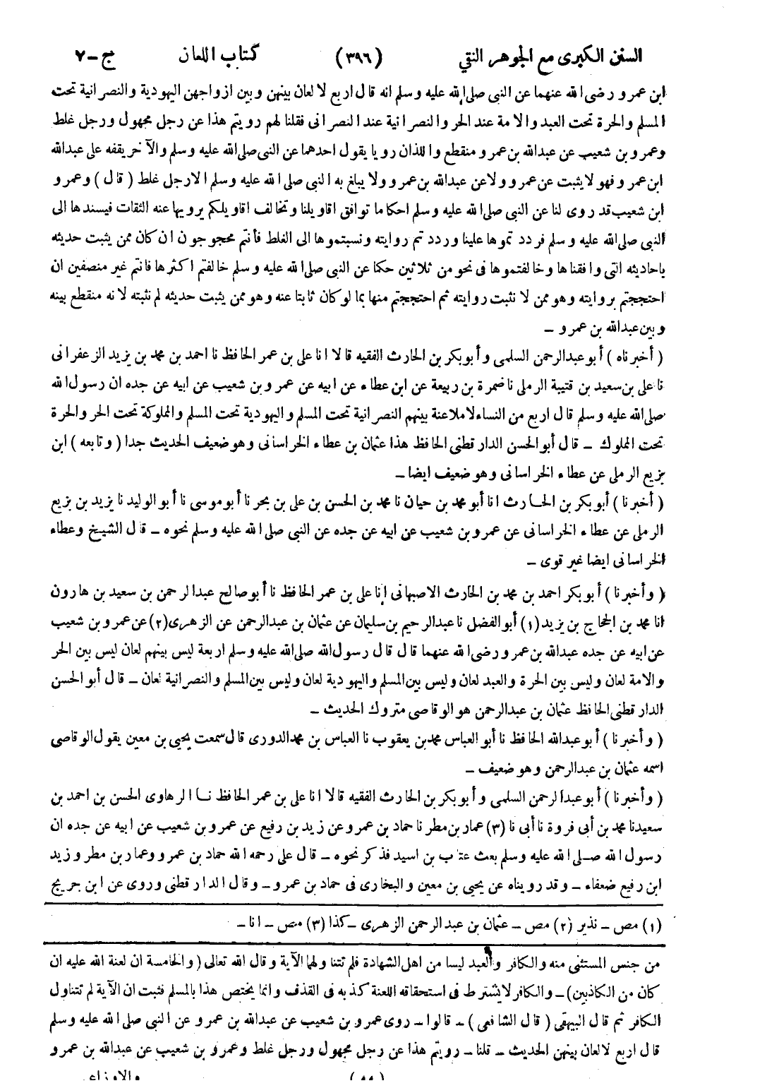 من جنس المستثنى منه والكافر والعبد ليسا من اهل الشهادة فلم تتنا ولهما الآية وقال الله تعالى (والخامسة ان لعنة الله عليه ان كان من الكاذبين) - والكافر لا يشترط في استحقاقه اللعنة كذبه في القذف وانما يختص هذا بالمسلم فثبت ان الآية لم تتناول الكافر ثم قال البيهقى (قال الشافعي) - قالوا - روى عمرو بن شعيب عن عبد الله بن عمرو عن النبي صلى الله عليه وسلم قال اربع لالعان بينهن الحديث - قلنا - رويتم هذا عن رجل مجهول ورجل غلط وعمرو بن شعيب عن عبد الله بن عمرو