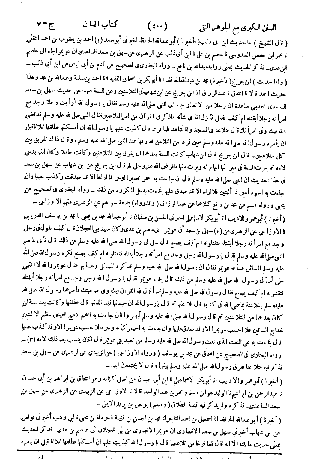 (قال الشيخ) اما حديث ابن أبى ذئب (فأخبرنا) أبو عبد الله الحافظ اخبرني أبو سعد (1) احمد بن يعقوب بن احمد الثقفى نا عمر ابن حفص السدوسى نا عاصم بن على نا ابن أبى ذئب عن الزهري عن سهل بن سعد الساعدي ان عويمرا جاء إلى عاصم ابن عدى - فذكر الحديث بمعنى رواية عبد الله بن نافع - رواه البخاري في الصحيح عن آدم بن أبى اياس عن ابن أبى ذئب - (واما حديث) ابن جريج (فأخبرنا) محمد بن عبد الله الحافظ انا أبو بكر بن اسحاق الفقيه انا احمد بن سلمة و عبد الله بن محمد وهذا حديث احمد قالا نا اسحاق نا عبد الرزاق انا ابن جريج عن ابن شهاب في المتلاعنين وعن السنة فيهما عن حديث سهل بن سعد الساعدي احد بنى ساعدة ان رجلا من الانصار جاء إلى النبي صلى الله عليه وسلم فقال يا رسول الله أرأيت رجلا وجد مع امرأته رجلا أيقتله ام كيف يفعل فأنزل الله في شأنه ما ذكر في القرآن من امر المتلاعنين فقال النبي صلى الله عليه وسلم قد قضى الله فيك وفى امرأتك قال فتلاعنا في المسجد وانا شاهد فلما فرغا قال كذبت عليها يا رسول الله ان أمسكتها فطلقها ثلاثا قبل ان يأمره رسول الله صلى الله عليه وسلم حين فرغا من التلاعن ففارقها عند النبي صلى الله عليه وسلم ، وقال ذاك تفريق بين كل متلاعنين - قال ابن جريج قال ابن شهاب كانت السنة بعدهما ان يفرق بين المتلاعنين وكانت حاملا وكان ابنها يدعى لامه ثم جرت السنة في ميراثها انها ترثه ويرث منها ما فرض الله عز وجل لهما قال ابن جريج عن ابن شهاب عن سهل بن سعد في هذا الحديث ان النبي صلى الله عليه وسلم قال ان جاءت به احمر قصيرا أو حر فما اراها الا قد صدقت وكذب عليها وان جاءت به اسود أعين ذا أليتين فلا اراه الا قد صدق عليها فجاءت به على المكروه من ذلك - رواه البخاري في الصحيح عن يحيى ورواه مسلم عن محمد بن رافع كلاهما عن عبد الرزاق (وقد رواه) جماعة سواهم عن الزهري منهم الاوزاعي