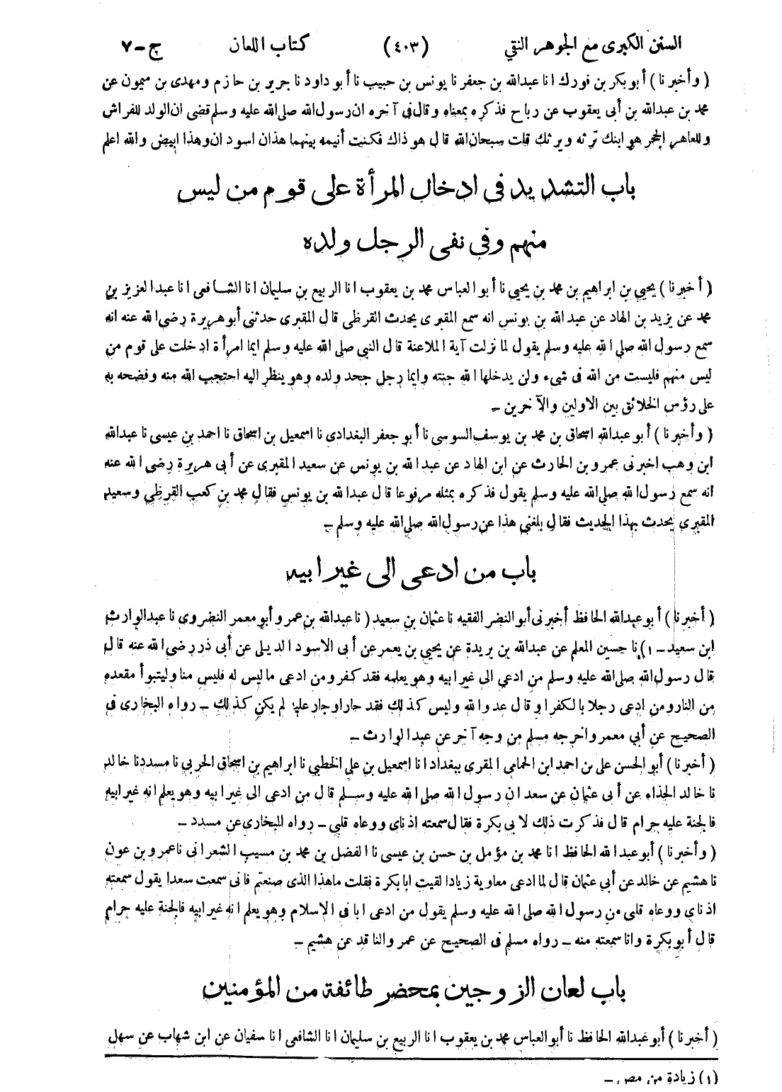(وأخبرنا) أبو بكر بن فورك انا عبد الله بن جعفر نا يونس بن حبيب نا أبو داود نا جرير بن حازم ومهدى بن ميمون عن محمد بن عبد الله بن أبى يعقوب عن رباح فذكره بمعناه وقال في آخره ان رسول الله صلى الله عليه وسلم قضى ان الولد للفراش وللعاهر الحجر هو ابنك ترثه ويرثك قلت سبحان الله قال هو ذاك فكنت أنيمه بينهما هذان اسودان وهذا ابيض والله اعلم باب التشديد في ادخال المرأة على قوم من ليس