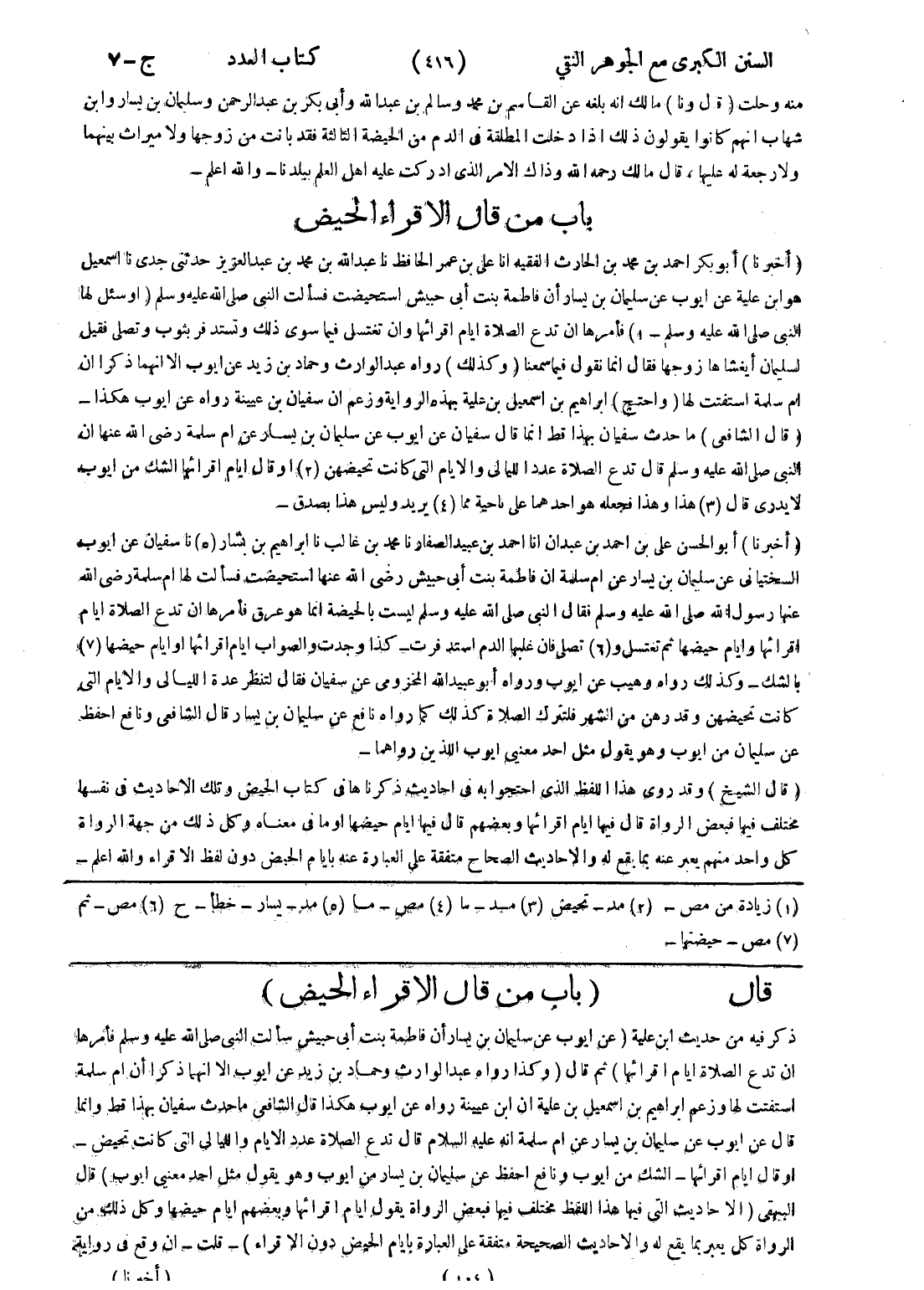 ذكر فيه من حديث ابن علية (عن ايوب عن سليمان بن يسار أن فاطمة بنت أبى حبيش سألت النبي صلى الله عليه وسلم فأمرها ان تدع الصلاة زايام اقرائها) ثم قال (وكذا رواه عبد الوارث وحماد بن زيد عن ايوب الا انهما ذكرا أن ام سلمة استفتت لها وزعم ابراهيم بن اسمعيل بن علية ان ابن عيينة رواه عن ايوب هكذا قال الشافعي ما حدث سفيان بهذا قط وانما قال عن ايوب عن سليمان بن يسار عن ام سلمة انه عليه السلام قال تدع الصلاة عدد الايام والليالي التى كانت تحيض - أو قال ايام اقرائها - الشك من ايوب ونافع احفظ عن سليمان بن يسار من ايوب وهو يقول مثل احد معنيى ايوب) قال البيهقى (الاحاديث التى فيها هذا اللفظ مختلف فيها فبعضا الرواة يقول ايام اقرائها وبعضهم ايام حيضها وكل ذلك من الرواة كل يعبر بما يقع له والاحاديث الصحيحة متفقة على العبارة بايام الحيض دون الاقراء) - قلت - ان وقع في رواية