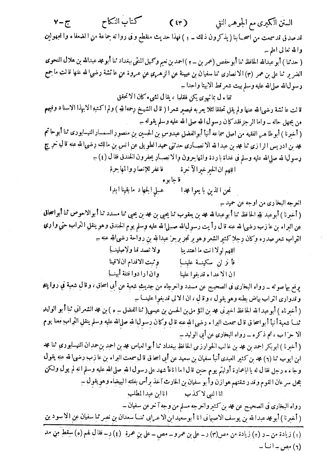 - (أخبرنا) أبو طاهر الفقيه من اصل سماعه أنبأ أبو الفضل عبدوس بن الحسين بن منصور السمسار النيسابوري ثنا أبو حاتم محمد بن ادريس الرازي ثنا محمد بن عبد الله الانصاري حدثنى حميد الطويل عن انس بن مالك رضى الله عنه قال خرج رسول الله صلى الله عليه وسلم في غداة باردة والمهاجرون والانصار يحفرون الخندق فقال (4) - اللهم ان الخير خير الآخرة * فاغفر للانصار والمهاجرة فأجابوه نحن الذين بايعوا محمدا * على الجهاد ما بقينا ابدا اخرجه البخاري من اوجه عن حميد