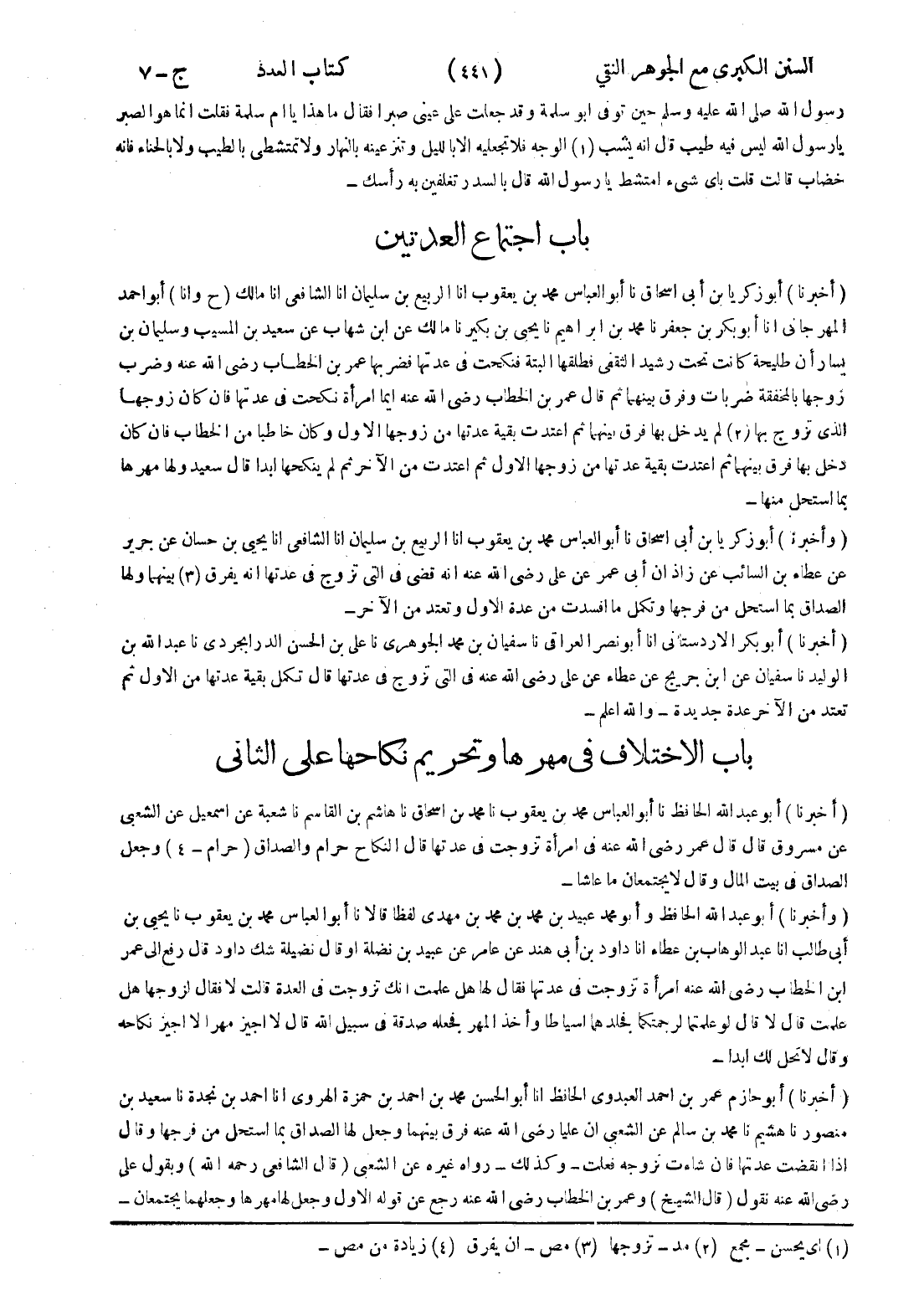 - (وأخبرنا) أبو زكريا بن أبى اسحاق نا أبو العباس محمد بن يعقوب انا الربيع بن سليمان انا الشافعي انا يحيى بن حسان عن جرير عن عطاء بن السائب عن زاذان أبى عمر عن على رضى الله عنه انه قضى في التى تزوج في عدتها انه يفرق (3) بينهما ولها الصداق بما استحل من فرجها وتكمل ما افسدت من عدة الاول وتعتد من الآخر