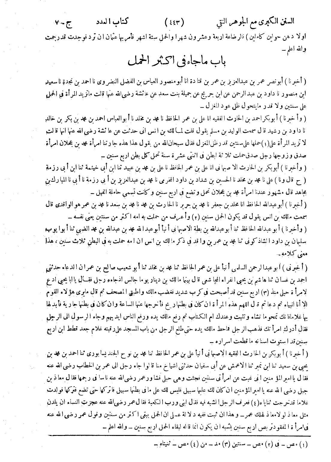 - (وأخبرنا) أبو بكر احمد بن الحارث الفقيه انا على بن عمر الحافظ نا محمد بن مخلد نا أبو العباس احمد بن محمد بن بكر بن خالد نا داود بن رشيد قال سمعت الوليد بن مسلم يقول قلت لمالك بن انس انى حدثت عن عائشة رضى الله عنها انها قالت لا تزيد المرأة على (1) حملها على سنتين قدر ظل المغزل فقال سبحان الله من يقول هذا هذه جارتنا امرأة محمد بن عجلان امرأة صدق وزوجها رجل صدق حملت ثلاثة ابطن في اثنتى عشرة سنة تحمل كل بطن اربع سنين
