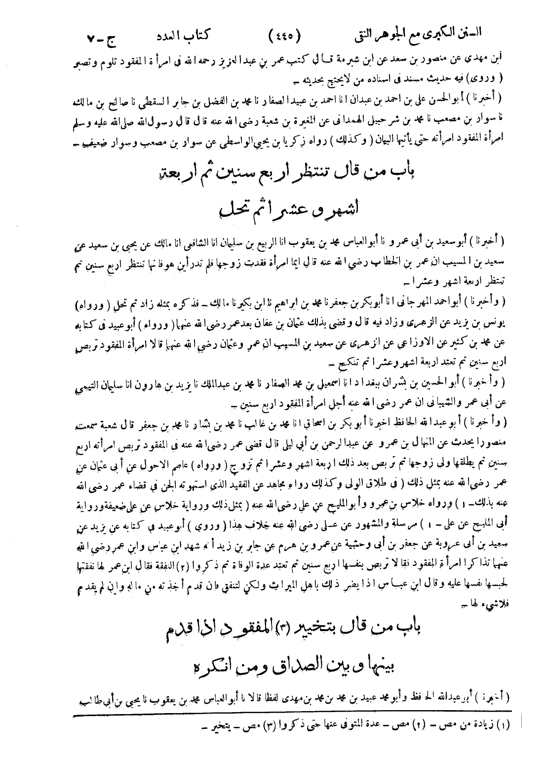 - (وأخبرنا) أبو عبد الله الحافظ اخبرنا أبو بكر بن اسحاق انا محمد بن غالب نا محمد بن جعفر قال شعبة سمعت منصورا يحدث عن المنهال بن عمرو عن عبد الرحمن بن أبى ليلى قال قضى عمر رضى الله عنه في المفقود تربص امرأته اربع سنين ثم يطلقها ولى زوجها ثم تربص بعد ذلك اربعة اشهر وعشرا ثم تزوج (ورواه) عاصم الاحول عن أبى عثمان عن عمر رضى الله عنه بمثل ذلك (في طلاق الولى وكذلك رواه مجاهد عن الفقيد الذى استهوته الجن في قضاء عمر رضى الله عنه بذلك - 1) ورواه خلاس بن عمرو وأبو المليح عن على رضى الله عنه (بمثل ذلك ورواية خلاس عن على ضعيفة ورواية أبى المليح عن على - 1) مرسلة والمشهور عن على رضى الله عنه خلاف هذا (وروى) أبو عبيد في كتابه عن يزيد عن سعيد بن أبى عروبة عن جعفر بن أبى وحشية عن عمرو بن هرم عن جابر بن زيد أنه شهد ابن عباس وابن عمر رضى الله عنهما تذاكر امرأة المفقود فقالا تربص بنفسها اربع سنين ثم تعتد عدة الوفاة ثم ذكروا (2) النفقة فقال ابن عمر لها نفقتها لحبسها نفسها عليه وقال ابن عباس إذا يضر ذلك باهل الميراث ولكن لتنفق فان قدم أخذته من ماله وان لم يقدم فلا شئ لها