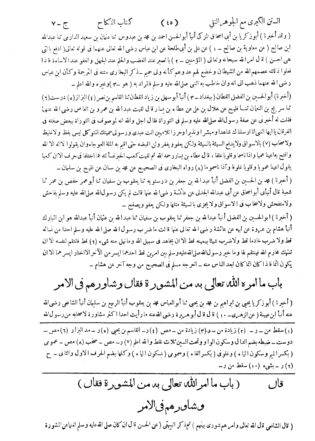 قال (باب ما امر الله تعالى به من المشورة فقال) وشاورهم في الامر (قال الشافعي قال الله تعالى وامرهم شورى بينهم) ثم ذكر البيهقى (عن الحسن قال ان كان صلى الله عليه وسلم لغنيا عن المشورة