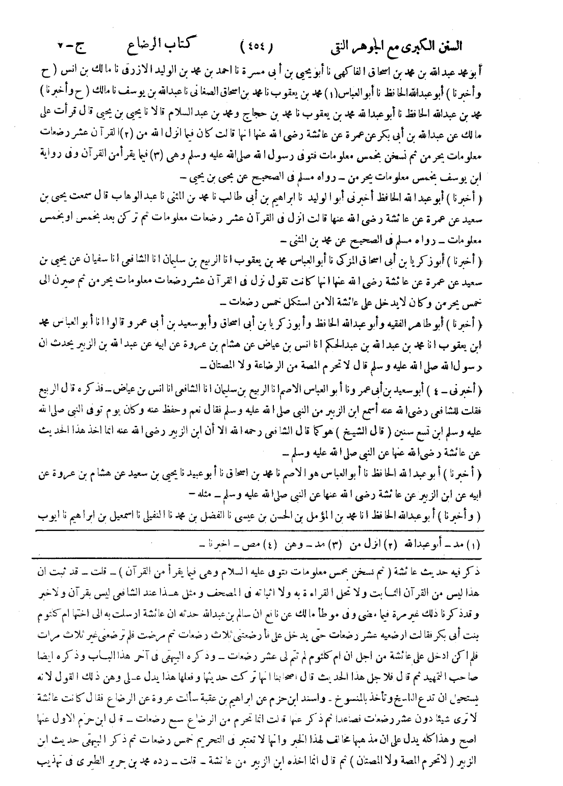 ذكر فيه حديث عائشة (ثم نسخن بخمس معلومات؟؟؟ عليه السلام وهى فيما يقرأ من القرآن) - قلت - قد ثبت ان هذا ليس من القرآن الثابت ولا تحل القراءة به ولا اثباته في المصحف ومثل هذا عند الشافعي ليس بقرآن ولا خبر وقد ذكرنا ذلك غير مرة فيما مضى وفي موطأ مالك عن نافع ان سالم بن عبد الله حدثه ان عائشة ارسلت به إلى اختها ام كلثوم بنت أبى بكر فقالت ارضعيه عشر رضعات حتى يدخل على فأرضعتني ثلاث رضعات ثم مرضت فلم ترضعني غير ثلاث مرات فلم اكن ادخل على عائشة من اجل ان ام كلثوم لم تتم لى عشر رضعات - وذكره البيهقى في آخر هذا الباب وذكره ايضا صاحب التمهيد ثم قال فلاجل هذا الحديث قال اصحابنا انها تركت حديثها وفعلها هذا يدل على وهن ذلك القول لانه يستحيل ان تدع الناسخ وتأخذ بالمنسوخ - واسند ابن حزم عن ابراهيم بن عقبة سألت عروة عن الرضاع فقال كانت عائشة لا ترى شيئا دون عشر رضعات فصاعدا ثم ذكر عنها قالت انما تحرم من الرضاع سبع رضعات - قال ابن حزم الاول عنها اصح وهذا كله يدل على ان مذهبها مخالف لهذا الخبر وانها لا تعتبر في التحريم خمس رضعات ثم ذكر البيهقى حديث ابن الزبير (لا تحرم المصة ولا المصتان) ثم قال انما اخذه ابن الزبير من عائشة - قلت - رده محمد بن جرير الطبري في تهذيب