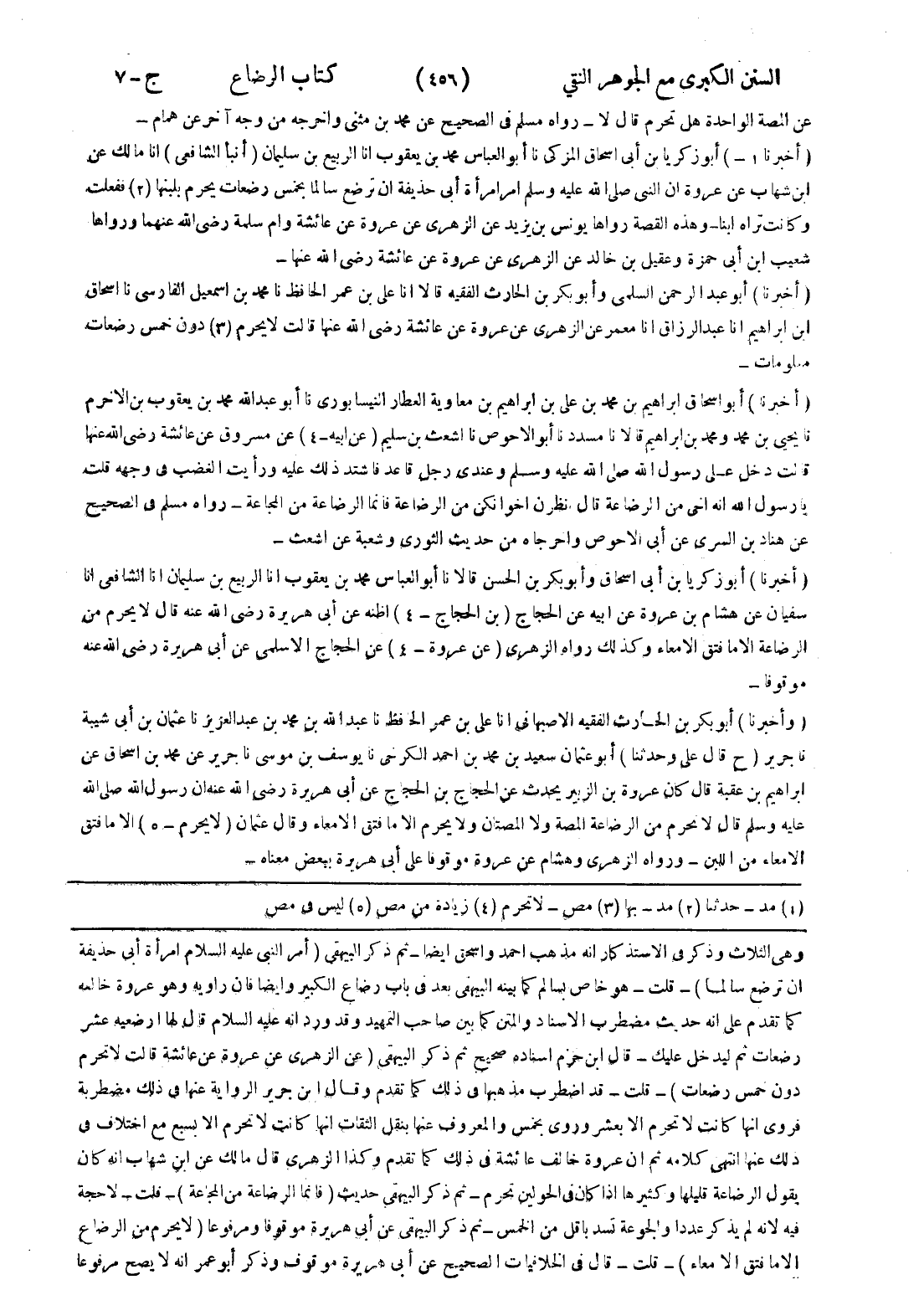 وهى الثلاث وذكر في الاستذكار انه مذهب احمد واسحق ايضا - ثم ذكر البيهقى (أمر النبي عليه السلام امرأة أبى حذيفة ان ترضع سالما) - قلت - هو خاص بسالم كما بينه البيهقى بعد في باب رضاع الكبير وايضا فان راويه وهو عروة خالفه كما تقدم على انه حديث مضطرب الاسناد والمتن كما بين صاحب التمهيد وقد ورد انه عليه السلام قال لها ارضعيه عشر رضعات ثم ليدخل عليك - قال ابن حزم اسناده صحيح ثم ذكر البيهقى (عن الزهري عن عروة عن عائشة قالت لا تحرم دون خمس رضعات) - قلت - قد اضطرب مذهبها في ذلك كما تقدم وقال ابن جرير الرواية عنها في ذلك مضطربة فروى انها كانت لا تحرم الا بعشر وروى بخمس والمعروف عنها بنقل الثقات انها كانت لا تحرم الا بسبع مع اختلاف في ذلك عنها انتهى كلامه ثم ان عروة خالف عائشة في ذلك كما تقدم وكذا الزهري قال مالك عن ابن شهاب انه كان يقول الرضاعة قليلها وكثيرها إذا كان في الحولين تحرم - ثم ذكر البيهقى حديث (فانما الرضاعة من المجاعة) - قلت - لا حجة فيه لانه لم يذكر عددا والجوعة تسد باقل من الخمس - ثم ذكر البيهقى عن أبى هريرة موقوفا ومرفوعا (لا يحرم من الرضاع الا ما فتق الا معاء) - قلت - قال في الخلافيات الصحيح عن أبى هريرة موقوف وذكر أبو عمر انه لا يصح مرفوعا