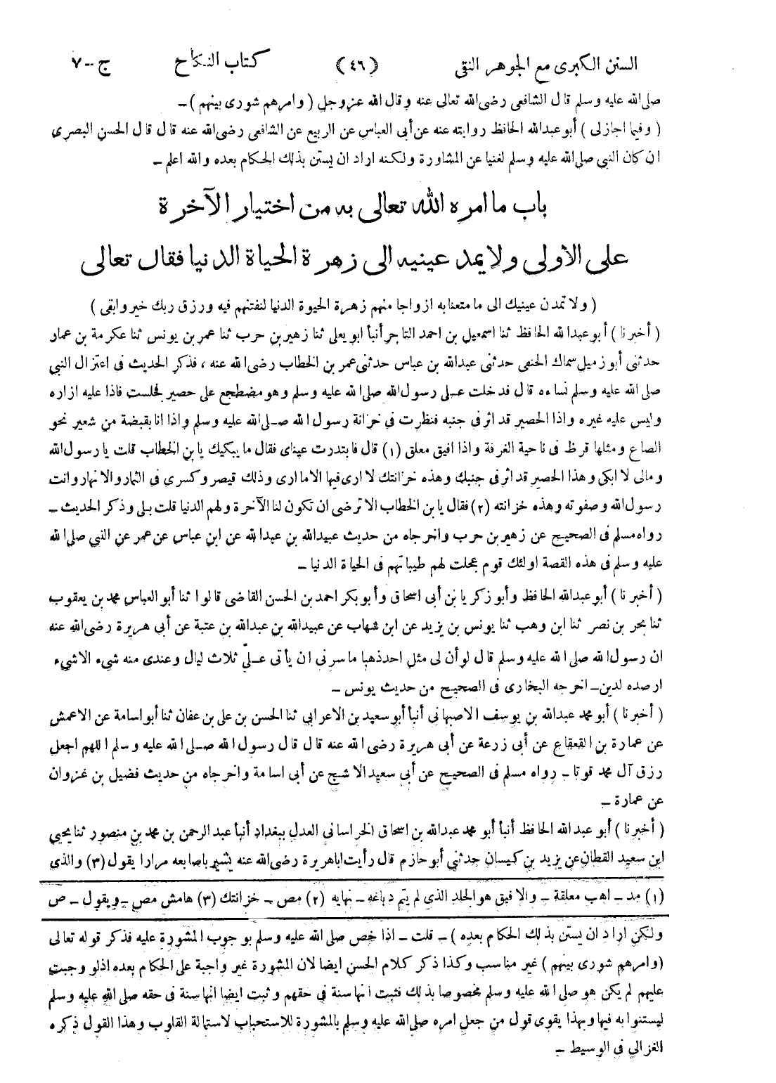 ولكن اراد ان يستن بذلك الحكام بعده) - قلت - إذا خص صلى الله عليه وسلم بوجوب المشورة عليه فذكر قوله تعالى (وامرهم شورى بينهم) غير مناسب وكذا ذكر كلام الحسن ايضا لان المشورة غير واجبة على الحكام بعده إذ لو وجبت عليهم لم يكن هو صلى الله عليه وسلم مخصوصا بذلك فثبت انها سنة في حقهم وثبت ايضا انها سنة في حقه صلى الله عليه وسلم ليستنوا به فيها وبهذا يقى قول من جعل امره صلى الله عليه وسلم بالمشورة للاستحباب لاستمالة القلوب وهذا القول ذكره الغزالي في الوسيط -