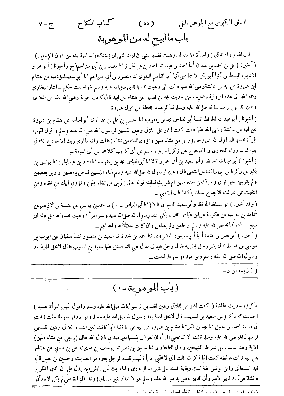 (باب الموهوبة - 1) ذكر فيه حديث عائشة (كنت اغار على اللاتى وهبن انفسهن لرسول الله صلى الله عليه وسلم واقول اتهب المرأة نفسها) الحديث ثم ذكر (عن سعيد بن المسيب قال لا تحل الهبة بعد رسول الله صلى الله عليه وسلم ولو اصدقها سوطا حلت) قلت في مسند احمد بن حنبل ثنا محمد بن بشر ثنا هشام بن عروة عن ابيه عن عائشة انها كانت تعير النساء اللاتى وهبن انفسهن لرسول الله صلى الله عليه وسلم قالت الا تستحيى المرأة ان تعرض نفسها بغير صداق فانزل الله تعالى (ترجى من تشاء منهن) الآية وهذا سند على شرط الشيخين وقال الطحاوي ثنا حسين بن نصر ثنا يوسف بن عدى ثنا على بن مسهر عن هشام عن ابيه قالت عائشة كنت إذا ذكرت قلت انى لاستحيى امرأة تهب نفسها لرجل بغير مهر الحديث وحسين بن نصر قال فيه السمعاني وابن يونس ثقة ثبت وبقية السند على شرط البخاري والحديث من الطريقين يدل على ان الذى انكرته عائشة هو ترك المهر لا غير وأن الذى خص به صلى الله عليه وسلم هو الانعقاد بغير صداق (وقد قال الشافعي لم يكن لاحد أن