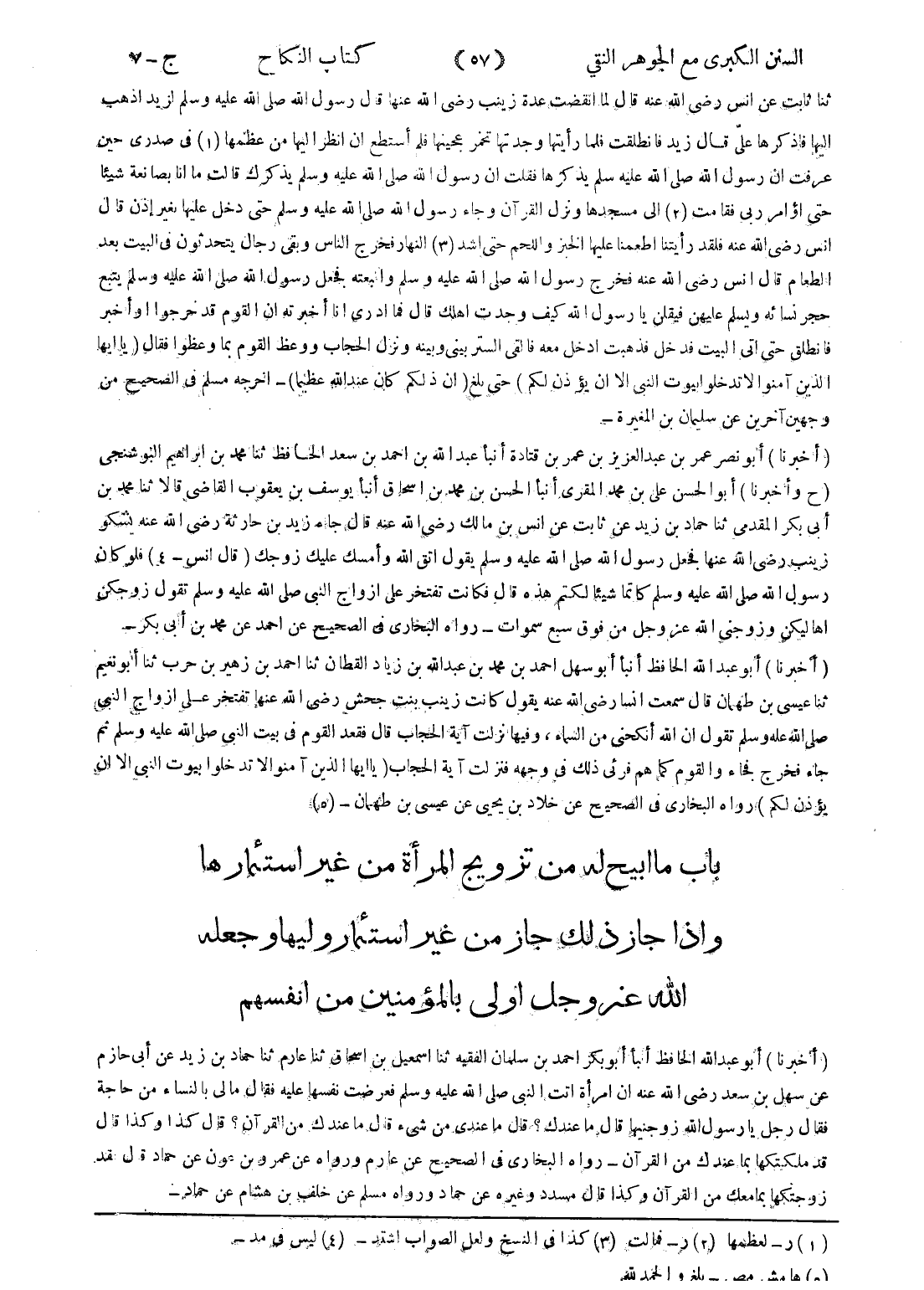 ثنا ثابت عن انس رضى الله عنه قال لما انقضت عدة زينب رضى الله عنها قال رسول الله صلى الله عليه وسلم لزيد اذهب إليها فاذكرها على قال زيد فانطلقت فلما رأيتها وجدتها تخمر عجينها فلم أستطع ان انظر إليها من عظمها (1) في صدري حين عرفت ان رسول الله صلى الله عليه وسلم يذكرها فقلت ان رسول الله صلى الله عليه وسلم يذكرك قالت ما انا بصانعة شيئا حتى اؤامر ربى فقامت (2) إلى مسجدها ونزل القرآن وجاء رسول الله صلى الله عليه وسلم حتى دخل عليها بغير إذن قال انس رضى الله عنه فلقد رأيتنا اطعمنا عليها الخبز واللحم حتى اشد (3) النهار فخرج الناس وبقى رجال يتحدثون في البيت بعد الطعام قال انس رضى الله عنه فخرج رسول الله صلى الله عليه وسلم واتبعته فجعل رسول الله صلى الله عليه وسلم يتبع حجر نسائه ويسلم عليهن فيقلن يا رسول الله كيف وجدت اهلك قال فما ادرى انا أخبرته ان القوم قد خرجوا وأخبر فانطلق حتى اتى البيت فدخل فذهبت ادخل معه فالقى الستر بينى وبينه ونزل الحجاب ووعظ القوم بما وعظوا فقال (يا ايها الذين آمنوا لا تدخلوا بيوت النبي الا ان يؤذن لكم) حتى بلغ (ان ذلكم كان عند الله عظيما) - اخرجه مسلم في الصحيح من وجهين آخرين عن سليمان بن المغيرة