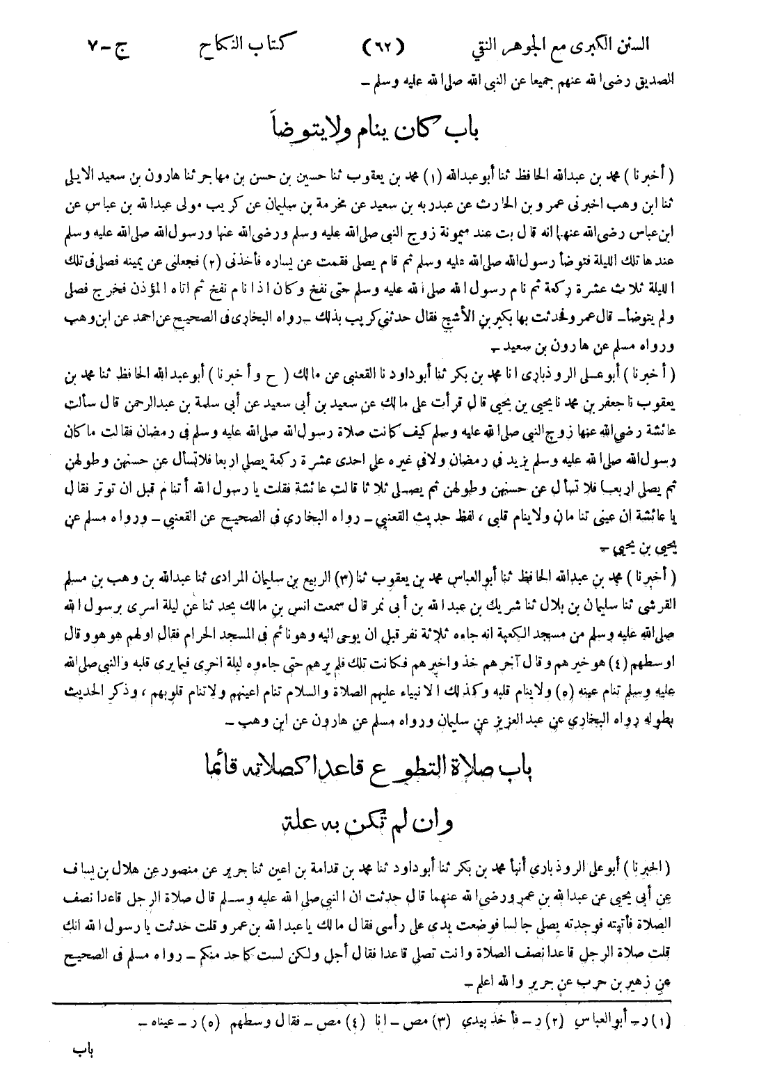 (أخبرنا) محمد بن عبد الله الحافظ ثنا أبو عبد الله (1) محمد بن يعقوب ثنا حسين بن حسن بن مهاجر ثنا هارون بن سعيد الايلى ثنا ابن وهب اخبرني عمر بن الحارث عن عبد ربه بن سعيد عن مخرمة بن سليمان عن كريب مولى عبد الله بن عباس عن ابن عباس رضى الله عنهما انه قال بت عند ميمونة زوج النبي صلى الله عليه وسلم ورضى الله عنها ورسول الله صلى الله عليه وسلم عندها تلك الليلة فتوضأ رسول الله صلى الله عليه وسلم ثم قام يصلى فقمت عن يساره فأخذني (2) فجعلني عن يمينه فصلى في تلك الليلة ثلاث عشرة ركعة ثم نام رسول الله صلى الله عليه وسلم حتى نفخ وكان إذا نام نفخ ثم اتاه المؤذن فخرج فصلى ولم يتوضأ - قال عمر وفحدثت بها بكير بن الاشج فقال حدثنى كريب بذلك - رواه البخاري في الصحيح عن احمد بن ابن وهب ورواه مسلم عن هارون بن سعيد