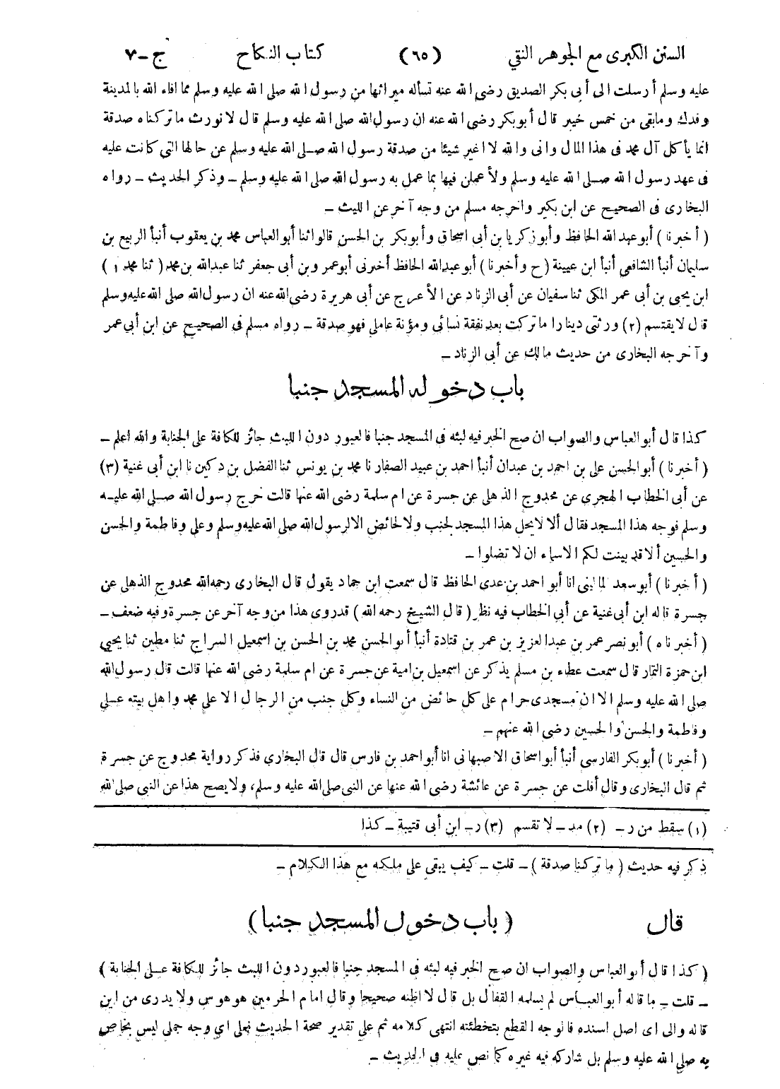 ذكر فيه حديث (ما تركنا صدقة) - قلت - كيف يبقى على ملكه مع هذا الكلام - قال (باب دخول المسجد جنبا) (كذا قال أبو العباس والصواب ان صح الخبر فيه لبثه في المسجد جنبا فالعبور دون اللبث جائز للكافة على الجنابة) - قلت - ما قاله أبو العباس لم يسلمه القفال بل قال لا اظنه صحيحا وقال امام الحرمين هو هوس ولا يدرى من اين قاله والى أي اصل اسنده فالوجه القطع بتخطئته انتهى كلامه ثم على تقدير صحة الحديث فعلى أي وجه جمل ليس بخاص به صلى الله عليه وسلم بل شاركه فيه غيره كما نص عليه في الحديث -