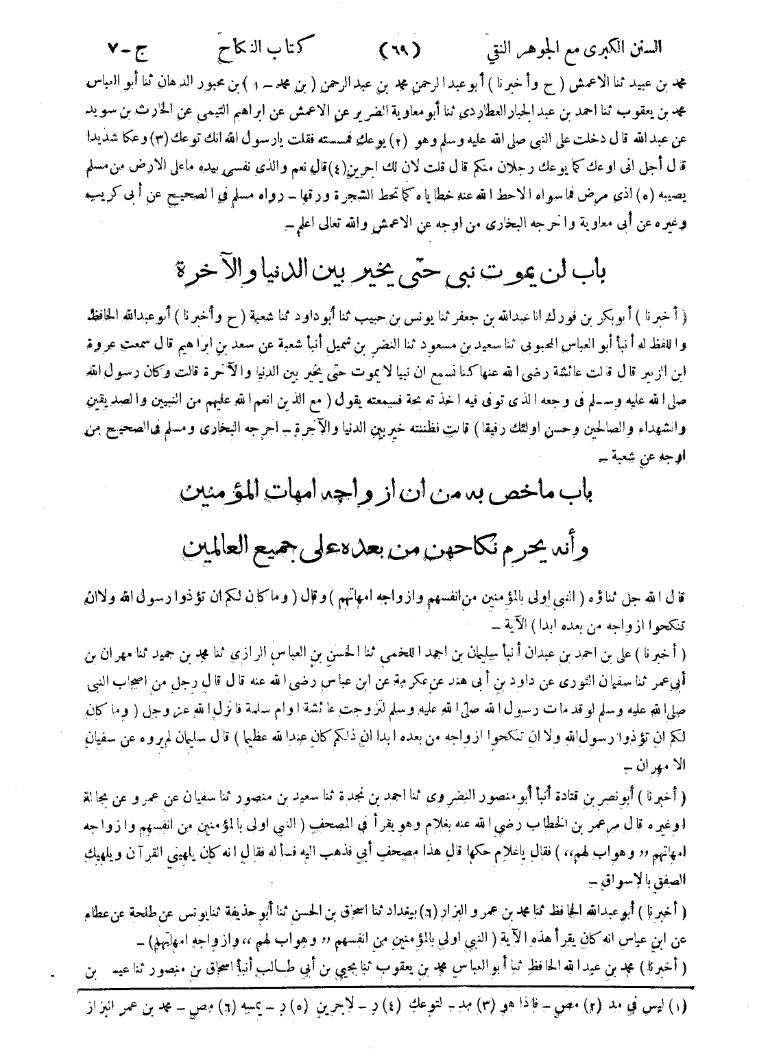 - باب ما خص به من ان ازواجه امهات المؤمنين وأنه يحرم نكاحهن من بعده على جميع العالمين قال الله جل ثناؤه (النبي اولى بالمؤمنين من انفسهم وازواجه امهاتهم) وقال (وما كان لكم ان تؤذوا رسول الله ولا ان
