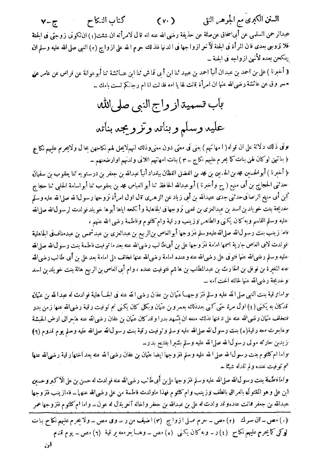 (1) مص - ان سرك (2) مص - حرم على ازواج (3) اضيف من ر - وفى مص - ولا يحرم عليهم نكاح بنات لو كن كما يحرم عليهم نكاح (4) ر - وبه كان يكنى (5) مص - وهاجر معه برقية (6) مص - يوم قدم (*)