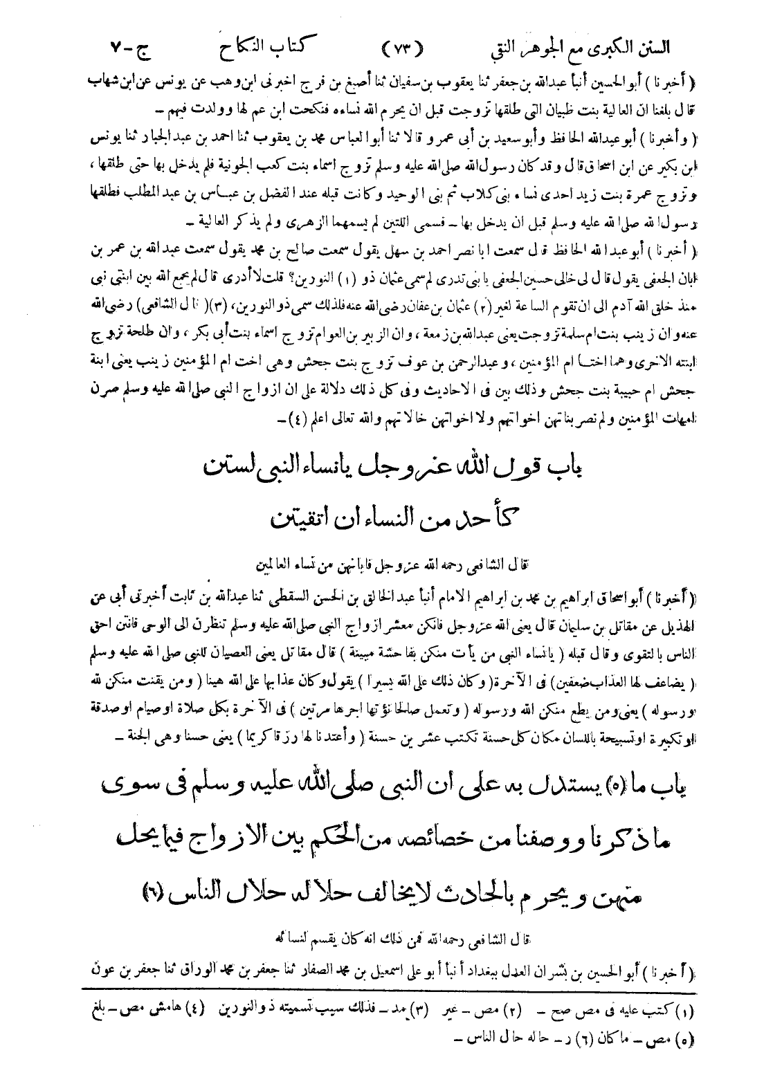 - (أخبرنا) أبو عبد الله الحافظ قال سمعت ابا نصر احمد بن سهل يقول سمعت صالح بن محمد يقول سمعت عبد الله بن عمر بن ابان الجعفي يقول قال لى خالي حسين الجعفي يا بنى تدرى لم سمى عثمان ذو (1) النورين ؟ قلت لا أدرى قال لم يجمع الله بين ابنتى نبى منذ خلق الله آدم إلى ان تقوم الساعة لغير (2) عثمان بن عفان رضى الله عنه فلذلك سمى ذو النورين ، (3) (قال الشافعي) رضى الله عنه وان زينب بنت ام سلمة تزوجت يعنى عبد الله بن زمعة ، وان الزبير بن العوام تزوج اسماء بنت أبى بكر ، وان طلحة تزوج ابنته الاخرى وهما اختا ام المؤمنين ، و عبد الرحمن بن عوف تزوج بنت جحش وهى اخت ام المؤمنين زينب يعنى ابنة جحش ام حبيبة بنت جحش وذلك بين في الاحاديث وفي كل ذلك دلالة على ان ازواج النبي صلى الله عليه وسلم صرن امهات المؤمنين ولم تصر بناتهن اخواتهم ولا اخواتهن خالاتهم والله تعالى اعلم (4)