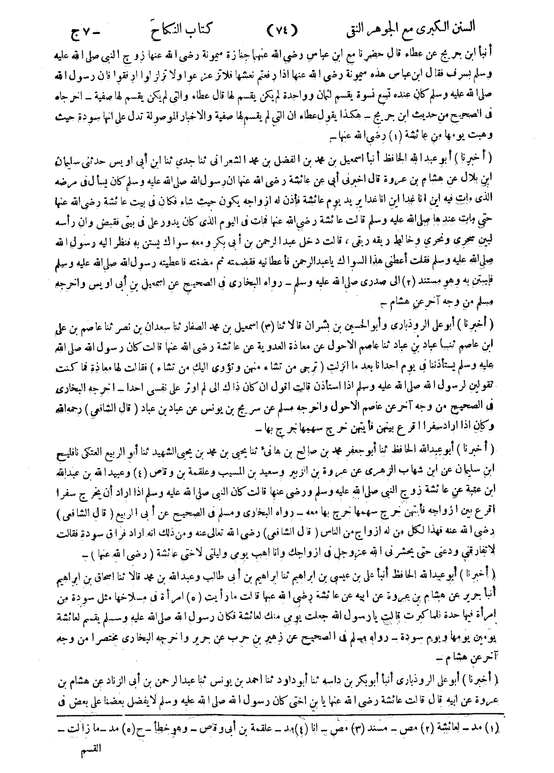 أنبأ ابن جريج عن عطاء قال حضرنا مع ابن عباس رضى الله عنهما جنازة ميمونة رضى الله عنها زوج النبي صلى الله عليه وسلم بسرف فقال ابن عباس هذه ميمونة رضى الله عنها إذا رفعتم نعشها فلا تزعزعوا ولا تزلزلوا ارفقوا فان رسول الله صلى الله عليه وسلم كان عنده تسع نسوة يقسم لثمان وواحدة لم يكن يقسم لها قال عطاء والتى لم يكن يقسم لها صفية - اخرجاه في الصحيح من حديث ابن جريج - هكذا يقول عطاء ان التى لم يقسم لها صفية والاخبار الموصولة تدل على انها سودة حيث وهبت يومها من عائشة (1) رضى الله عنها