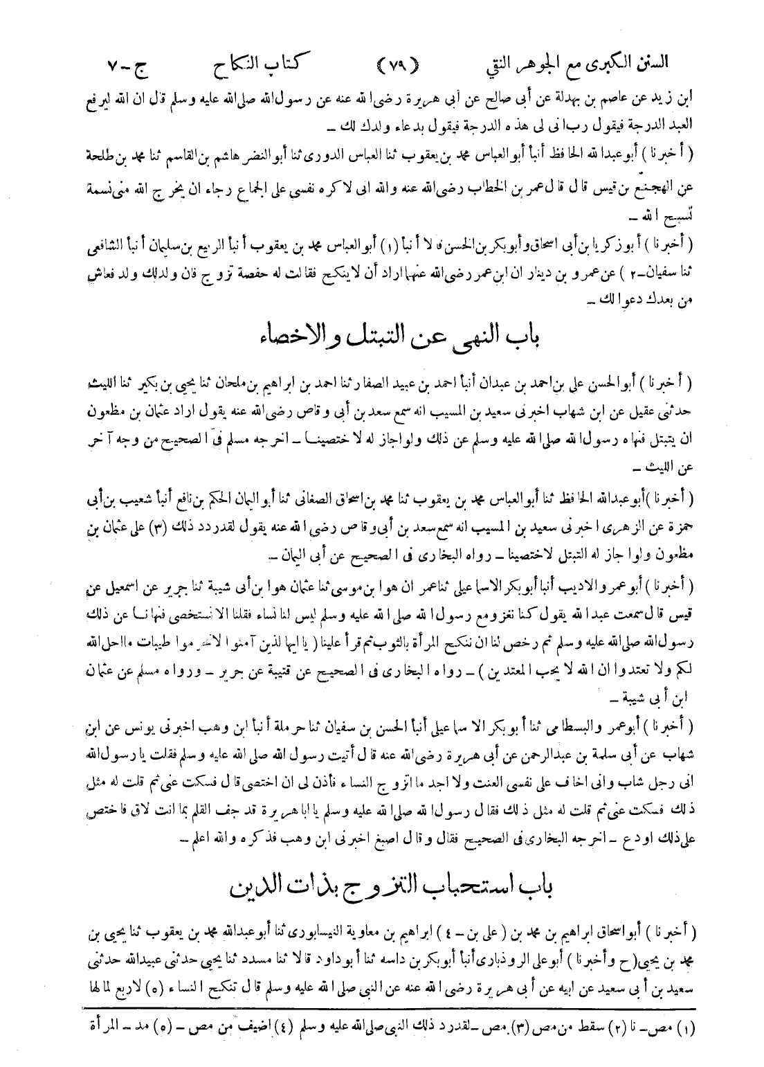 - (أخبرنا) أبو عبد الله الحافظ ثنا أبو العباس محمد بن يعقوب ثنا محمد بن اسحاق الصغانى ثنا أبو اليمان الحكم بن نافع أنبأ شعيب بن أبى حمزة عن الزهري اخبرني سعيد بن المسيب انه سمع سعد بن أبى وقاص رضى الله عنه يقول لقد ردد ذلك (3) على عثمان بن مظعون ولو اجاز له التبتل لاختصينا - رواه البخاري في الصحيح عن أبى اليمان