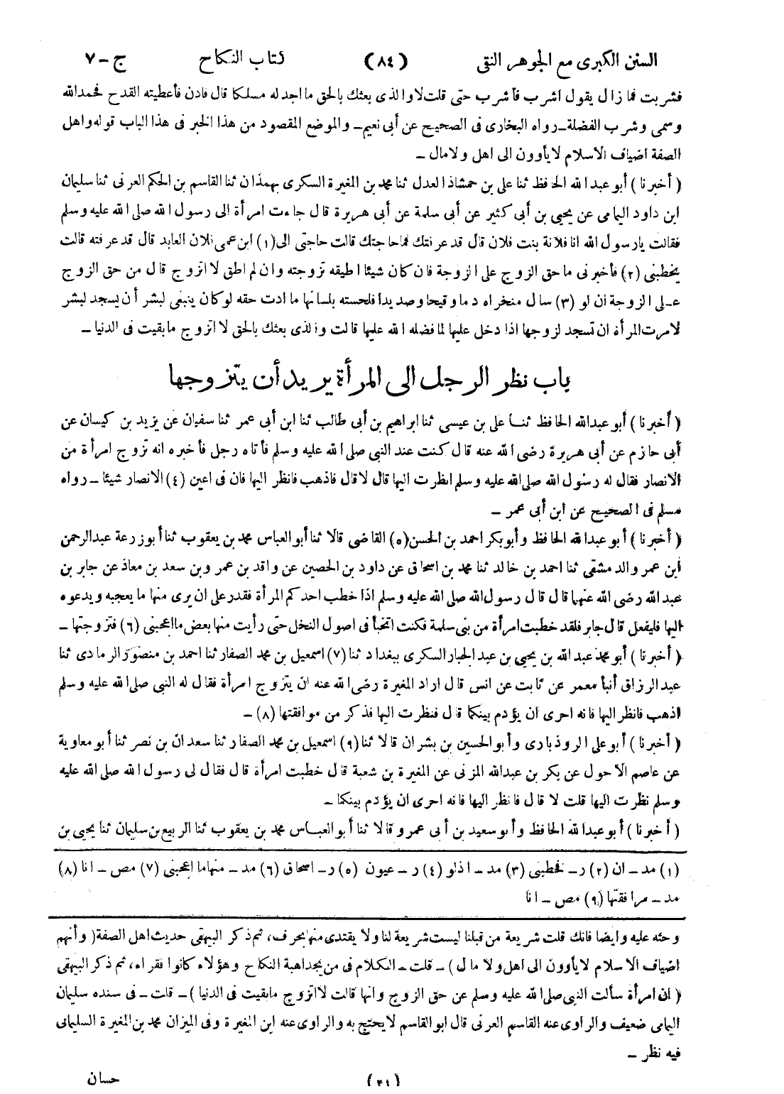 اضياف الاسلام لا يأوون إلى اهل ولا مال) - قلت - الكلام في من يجد اهبة النكاح وهؤلاء كانوا فقراء، ثم ذكر البيهقى (ان امرأة سألت النبي صلى الله عليه وسلم عن حق الزوج وانها قالت لا اتزوج ما بقيت في الدنيا) - قلت - في سنده سليمان اليمامى ضعيف والراوي عنه القاسم العرنى قال أبو القاسم لا يحتج به والراوي عنه ابن المغيرة وفي الميزان محمد بن المغيرة السليمانى فيه نظر -