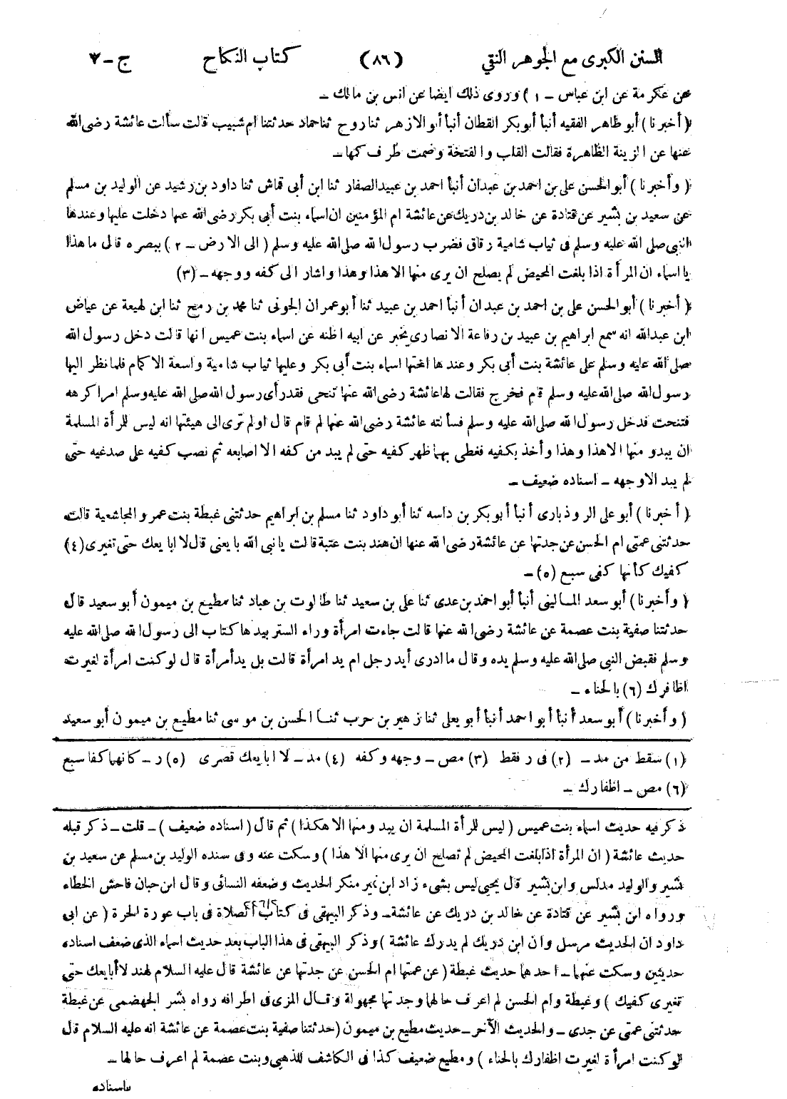 ذكر فيه حديث اسماء بنت عميس (ليس للمرأة المسلمة ان يبدو منها الا هكذا) ثم قال (اسناده ضعيف) - قلت - ذكر قبله حديث عائشة (ان المرأة إذا بلغت المحيض لم تصلح ان يرى منها الا هذا) وسكت عنه وفي سنده الوليد بن مسلم عن سعيد بن بشير والوليد مدلس وابن بشير قال يحيى ليس بشئ زاد ابن نمير منكر الحديث وضعفه النسائي وقال ابن حبان فاحش الخطاء ورواه ابن بشير عن قتادة عن خالد بن دريك عن عائشة - وذكر البيهقى في كتاب الصلاة في باب عورة الحرة (عن ابى داود ان الحديث مرسل وان ابن دريك لم يدرك عائشة) وذكر البيهقى في هذا الباب بعد حديث اسماء الذى ضعف اسناده حديثين وسكت عنهما - احدهما حديث غبطة (عن عمتها ام الحسن عن جدتها عن عائشة قال عليه السلام لهند لا أبا يعك حتى تغيري كفيك) وغبطة وام الحسن لم اعرف حالهما وجدتها مجهولة وقال المزى في اطرافه رواه بشر الجهضمى عن غبطة حدثتني عمتى عن جدى - والحديث الآخر - حديث مطيع بن ميمون (حدثتنا صفية بنت عصمة عن عائشة انه عليه السلام قال لو كنت امرأة لغيرت اظفارك بالحناء) ومطيع ضعيف كذا في الكاشف للذهبي وبنت عصمة لم اعرف حالها -