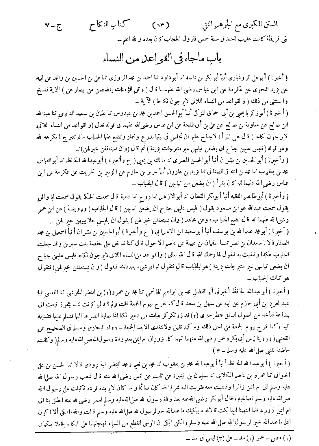 (أخبرنا) أبو على الروذبارى أنبأ أبو بكر بن داسه ثنا أبو داود ثنا احمد بن محمد المروزى ثنا على بن الحسين بن واقد عن ابيه عن يزيد النحوي عن عكرمة عن ابن عباس رضى الله عنهما قال (وقل للمؤمنات يغضضن من ابصارهن) الآية فنسخ واستثنى من ذلك (والقواعد من النساء اللاتى لا يرجون نكاحا) الاية
