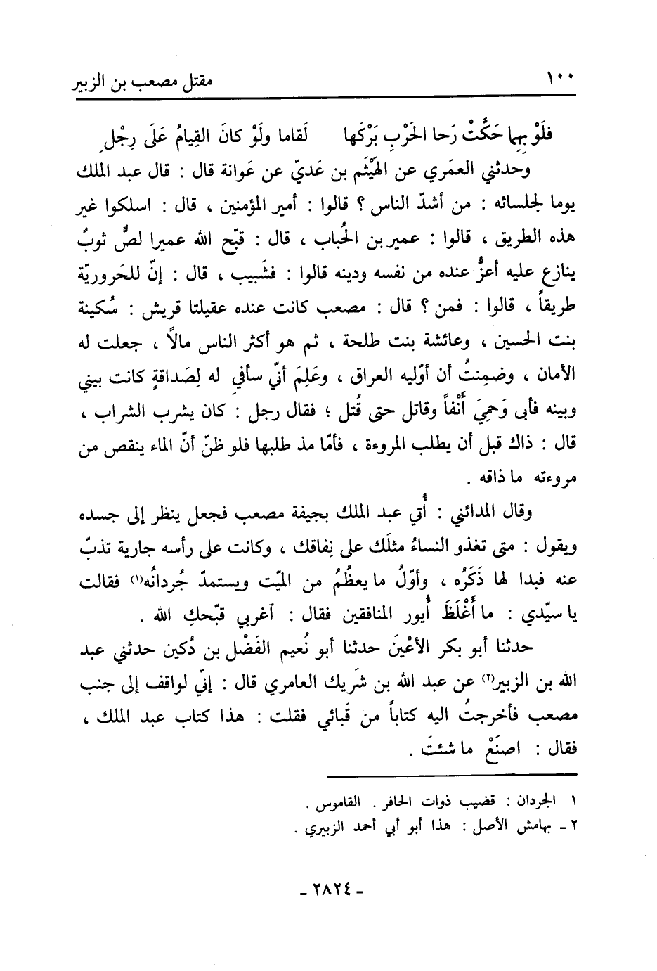 وَحَدَّثَنِي الْعُمَرِيُّ عَنِ الْهَيْثَمِ بْنِ عَدِيٍّ عَنْ عَوَانَةَ قال: قال عبد الملك يوما لجلسائه، من أشد النَّاس؟ قالوا: أَمِير الْمُؤْمِنِينَ، قَالَ: اسلكوا غير هذه الطريق، قالوا: عمير بْن الحباب، قَالَ: قبح اللَّه عميرا لص ثوب ينازع عَلَيْهِ أعز عنده من نفسه ودينه قالوا: فشبيب، قَالَ: إن للحرورية طريقا، قالوا: فمن؟ قَالَ: مصعب كانت عنده عقيلتا قريش: سكينة بنت الْحُسَيْن، وعائشة بنت طلحة، ثُمَّ هو أكثر النَّاس مالا، جعلت لَهُ الأمان، وضمنت أن أوليه العراق، وعلم أني سأفي لَهُ لصداقة كانت بيني وبينه فأبى وحمي أنفا وقاتل حَتَّى قتل، فَقَالَ رجل: كَانَ يشرب الشراب، قَالَ: ذاك قبل أن يطلب المروءة، فأما مذ طلبها فلو ظن أن الماء ينقص من مروءته مَا ذاقه.