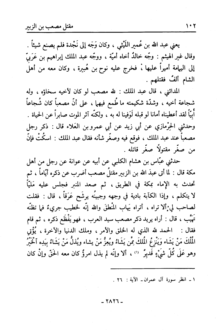 حَدَّثَنِي عَبَّاس بْن هِشَام الكلبي عن أبيه عن عَوَانَةَ عَنْ رَجُلٍ مِنْ أَهْلِ مَكَّةَ قَالَ: لَمَّا أَتَى عَبْدُ اللَّهِ بْنُ الزُّبَيْرِ مَقْتَلَ مُصْعَبٍ أَضْرَبَ عَن ذِكْرِهِ أَيَّامًا، ثُمَّ تَحَدَّثَ بِهِ الإِمَاءُ بِمَكَّةَ فِي الطَّرِيقِ، ثُمَّ صَعَدَ الْمِنْبَرَ فَجَلَسَ عَلَيْهِ مَلِيًّا لا يَتَكَلَّمُ، وَإِذَا الْكَآبَةُ بَادِيَةٌ فِي وَجْهِهِ وَجَبِينِهِ يَرْشَحُ عَرَقًا، قَالَ: فَقُلْتُ لِصَاحِبٍ لِي: أَلا تَرَاهُ، أَتُرَاهُ يَهَابُ الْمَنْطِقَ وَاللَّهِ إِنَّهُ لَخَطِيبٌ جَرِيءٌ فَمَا تَظُنُّهُ تَهَيَّبَ، قَالَ: أُرَاهُ يُرِيدُ ذِكْرَ مُصْعَبٍ سَيِّدِ الْعَرَبِ، فَهُوَ يَفْظَعُ ذِكْرَهُ، ثُمَّ قَامَ فَقَالَ: الْحَمْدُ لِلَّهِ الَّذِي لَهُ الْخَلْقُ وَالأَمْرُ، وَمُلْكُ الدُّنْيَا وَالآخِرَةِ، يُؤْتِي الْمُلْكَ مَنْ يَشَاءُ وَيَنْزِعُ الْمُلْكَ مِمَّنْ يَشَاءُ وَيُعِزُّ مَنْ يَشَاءُ وَيُذِلُّ مَنْ يَشَاءُ بِيَدِهِ الْخَيْرُ وَهُوَ عَلَى كُلِّ شَيْءٍ قَدِيرٌ [1] ، أَلا وَإِنَّهُ لَمْ يُذَلَّ امرؤ كان معه الحقّ وإن كان