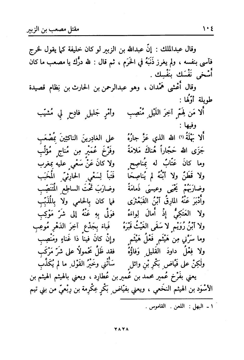 ألا بهلة [1] اللَّه الَّذِي عز جاره ... عَلَى الغادرين الناكثين بمصعب