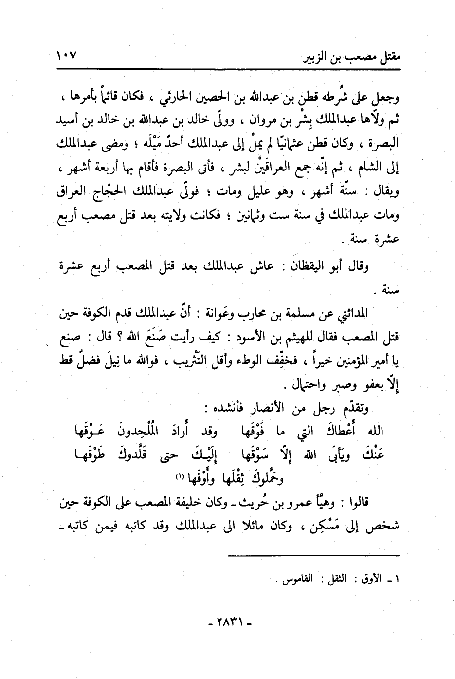 وَقَالَ أَبُو اليقظان: عاش عَبْد الْمَلِكِ بعد قتل المصعب أربع عشرة سنة.