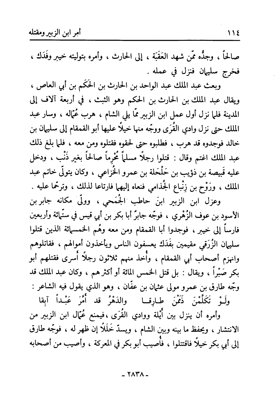 وأمره أن ينزل بين أيلة ووادي القرى، فيمنع عمال ابْن الزُّبَيْرِ من الانتشار، ويحفظ مَا بينه وبين الشام، ويسد خللا إن ظهر لَهُ، فوجه طارق إِلَى أَبِي بكر خيلا فاقتتلوا، فأصيب أَبُو بكر فِي المعركة، وأصيب من أصحابه