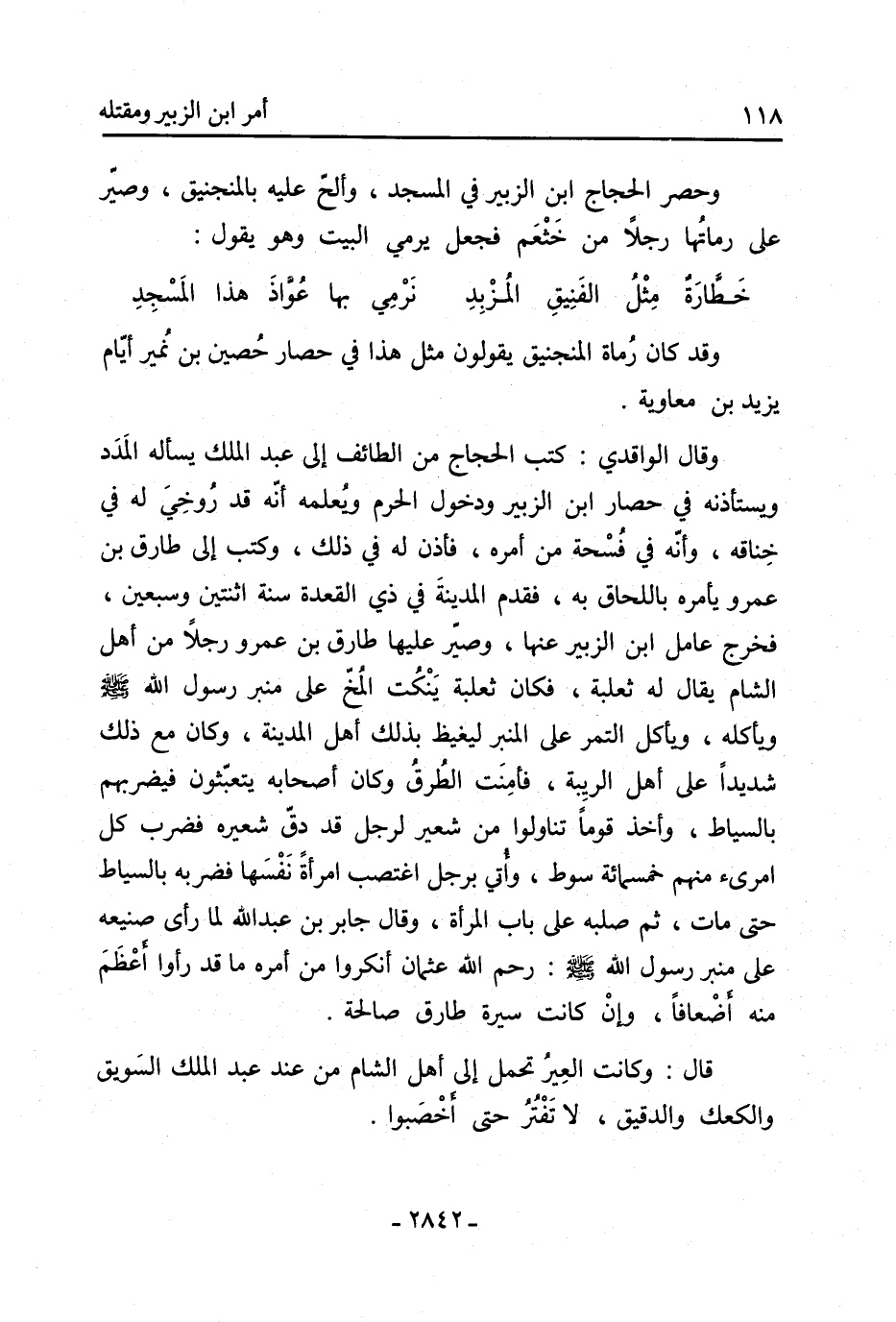 وَقَالَ الواقدي: كتب الحجاج من الطائف إِلَى عَبْد الْمَلِكِ يسأله المدد ويستأذنه فِي حصار ابْن الزُّبَيْرِ ودخول الحرم ويعلمه أنه قد روخي لَهُ فِي خناقه، وأنه فِي فسحة من أمره، فأذن لَهُ فِي ذَلِكَ، وكتب إِلَى طارق بْن عَمْرو يأمره باللحاق به، فقدم المدينة في ذي القعدة سنة اثنتين وسبعين، فخرج عامل ابْن الزُّبَيْرِ عنها، وصير عَلَيْهَا طارق بْن عَمْرو رجلا من أهل الشام يقال له ثعلبة، فكان ثعلبة ينكت المخ عَلَى منبر رَسُول اللَّهِ صَلَّى اللَّهُ عَلَيْهِ وَسَلَّمَ ويأكله، ويأكل التمر عَلَى المنبر ليغيظ بِذَلِكَ أَهْل المدينة، وَكَانَ مَعَ ذَلِكَ شديدا عَلَى أَهْل الريبة، فأمنت الطرق وَكَانَ أصحابه يتعبثون فيضربهم بالسياط، وأخذ قوما تناولوا من شعير لرجل قد دقّ شعيره فضرب كل امرئ منهم خمسمائة سوط، وأتي برجل اغتصب امرأة نفسها فضربه بالسياط حَتَّى مات، ثُمَّ صلبه عَلَى باب المرأة، وَقَالَ جابر بْن عَبْد اللَّهِ لما رأى صنيعه عَلَى منبر رَسُول اللَّهِ صَلَّى اللَّهُ عَلَيْهِ وَسَلَّمَ: رحم اللَّه عثمان أنكروا من أمره مَا قد رأوا أعظم منه أضعافا، وإن كانت سيرة طارق صالحة.