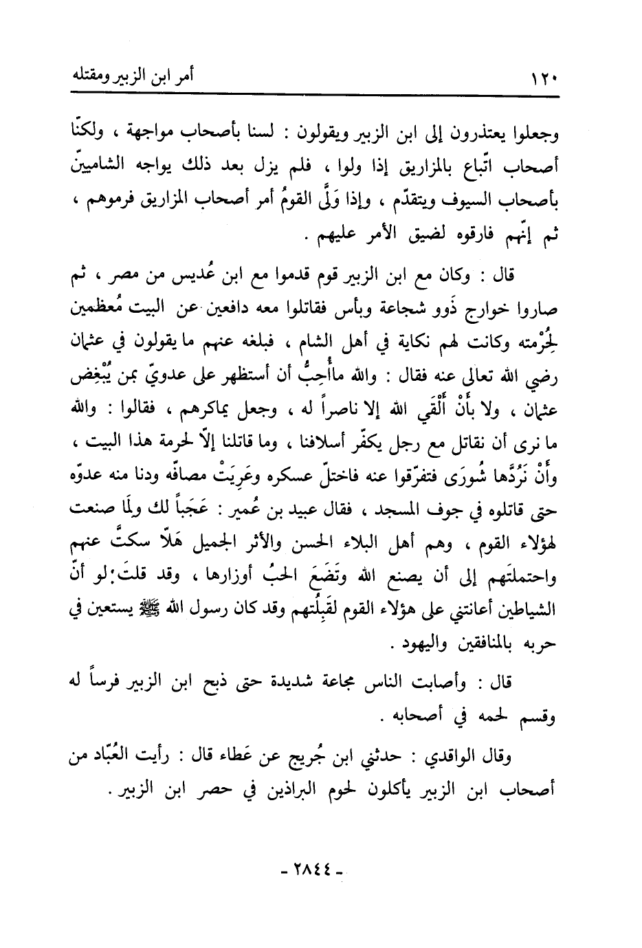 قَالَ: وَكَانَ مَعَ ابْن الزُّبَيْرِ قوم قدموا مَعَ ابْن عديس من مصر، ثُمَّ صاروا خوارج ذوو شجاعة وبأس فقاتلوا مَعَهُ دافعين عَن البيت معظمين لحرمته وكانت لهم نكاية فِي أَهْل الشام، فبلغه عنهم مَا يقولون فِي عثمان رضي اللَّه تعالى عنه فَقَالَ: والله مَا أحب أن أستظهر عَلَى عدوي بمن يبغض عثمان، ولا بأن ألقي اللَّه إلا ناصرا لَهُ، وجعل يماكرهم، فَقَالُوا: والله مَا نرى أن نقاتل مَعَ رجل يكفر أسلافنا، وما قاتلنا إلا لحرمة هذا البيت، وأن نردها شورى فتفرقوا عنه فاختل عسكره وعريت مصافه ودنا منه عدوه حَتَّى قاتلوه فِي جوف المسجد، فَقَالَ عبيد بْن عمير: عجبا لك ولما صنعت لهؤلاء القوم، وهم أَهْل البلاء الحسن والأثر الجميل هلا سكت عنهم واحتملتهم إِلَى أن يصنع اللَّه وتضع الحب أوزارها، وقد قلت: لو أن الشياطين أعانتني عَلَى هؤلاء القوم لقبلتهم وقد كَانَ رَسُولُ اللَّهِ صَلَّى اللَّهُ عَلَيْهِ وَسَلَّمَ يستعين فِي حربه بالمنافقين واليهود.