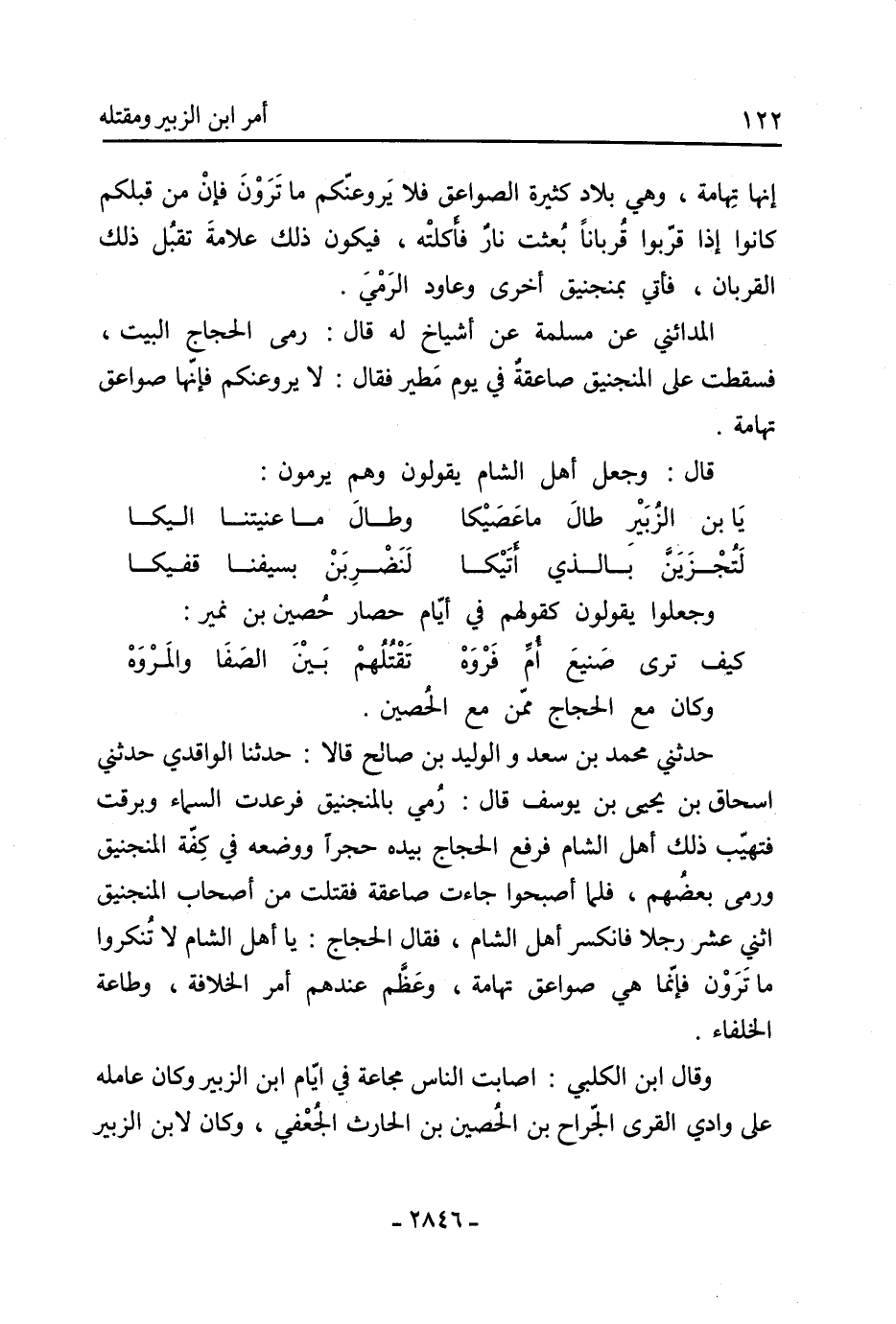حَدَّثَنِي مُحَمَّدُ بْنُ سَعْدٍ وَالْوَلِيدُ بْنُ صَالِحٍ قالا: حَدَّثَنَا الواقدي حَدَّثَنِي إِسْحَاق بْن يَحْيَى بْن يوسف قَالَ: رمي بالمنجنيق فرعدت السماء وبرقت فتهيب ذَلِكَ أَهْل الشام فرفع الحجاج بيده حجرا ووضعه فِي كفة المنجنيق ورمى بعضهم، فلما أصبحوا جاءت صاعقة فقتلت من أصحاب المنجنيق اثني عشر رجلا فانكسر أَهْل الشام، فَقَالَ الحجاج: يَا أَهْل الشام لا تنكروا مَا ترون فإنما هي صواعق تهامة، وعظم عندهم أمر الخلافة، وطاعة الخلفاء.
